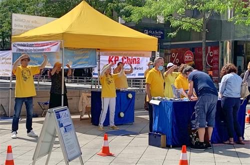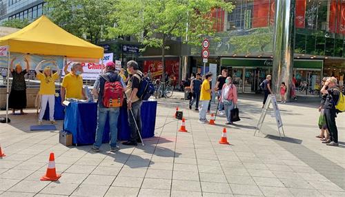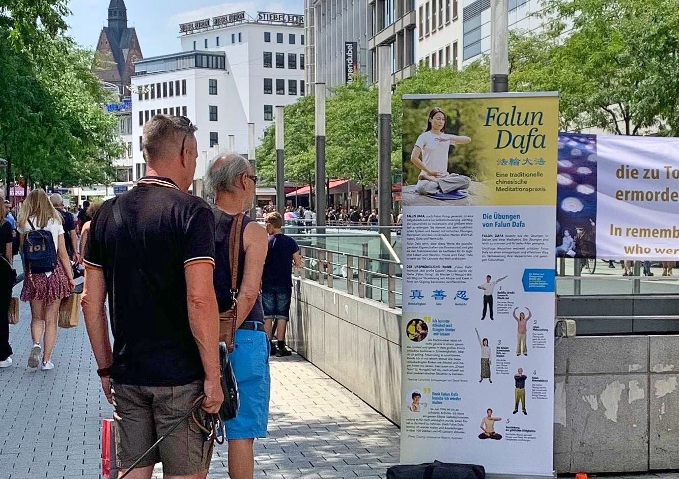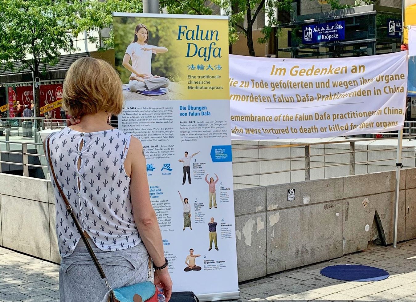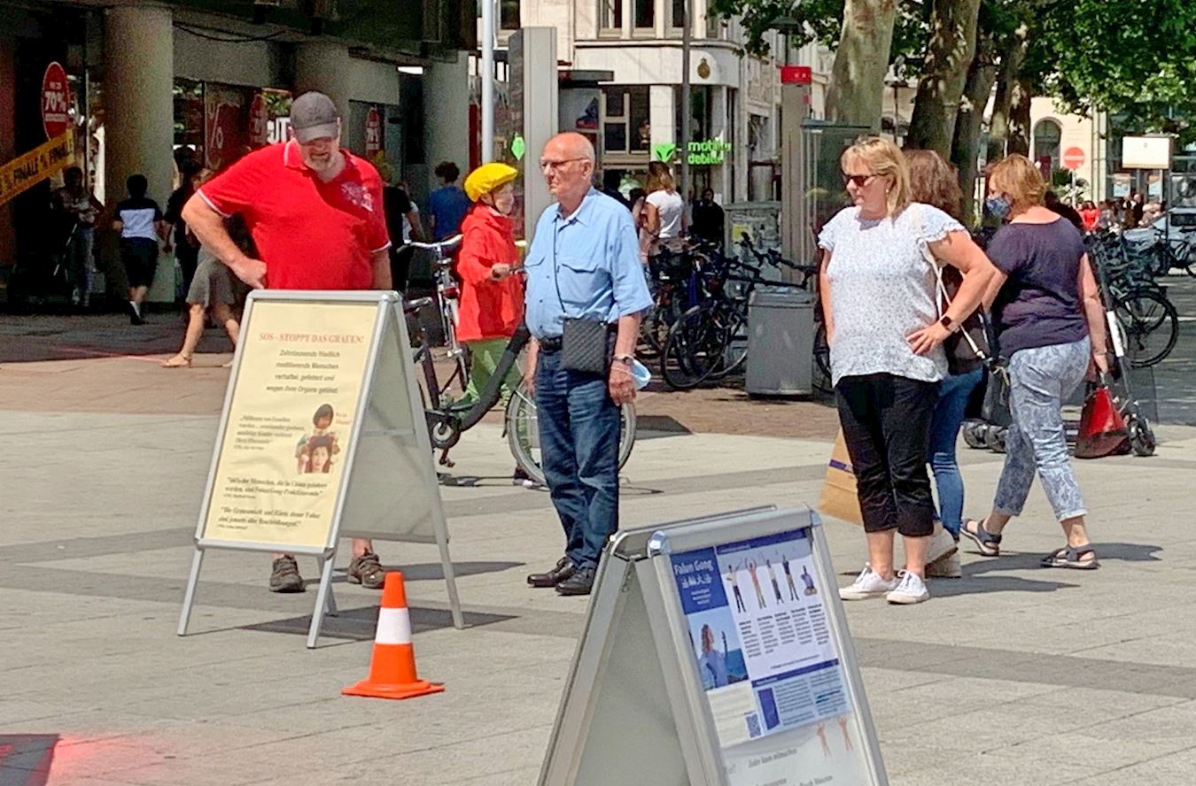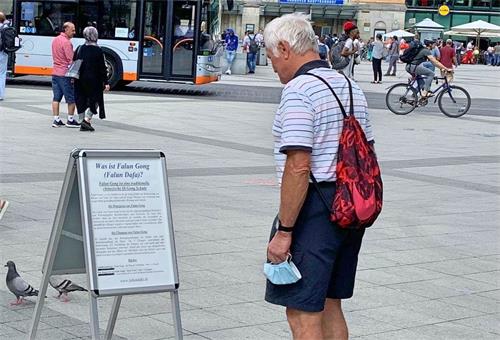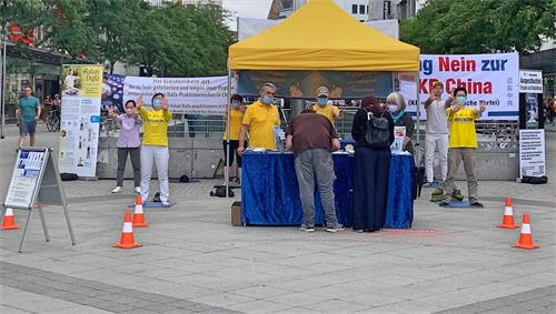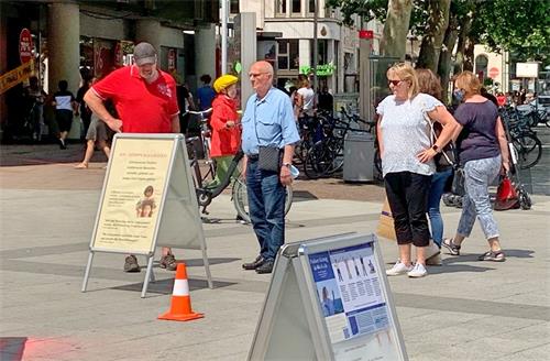 活动当天学员发现路过的中国人在改变,以前他们看到法轮功学员就绕着走,现在中国学生会站在法轮功学员的展板前阅读信息。有的接过学员递上的中文真相期刊小册子翻看浏览,有的和学员交谈,也有的中国人主动向学员拿了中文真相小册子和德文活摘器官的真相传单。