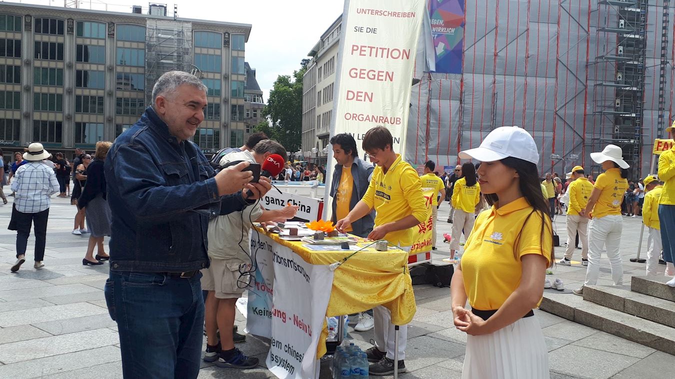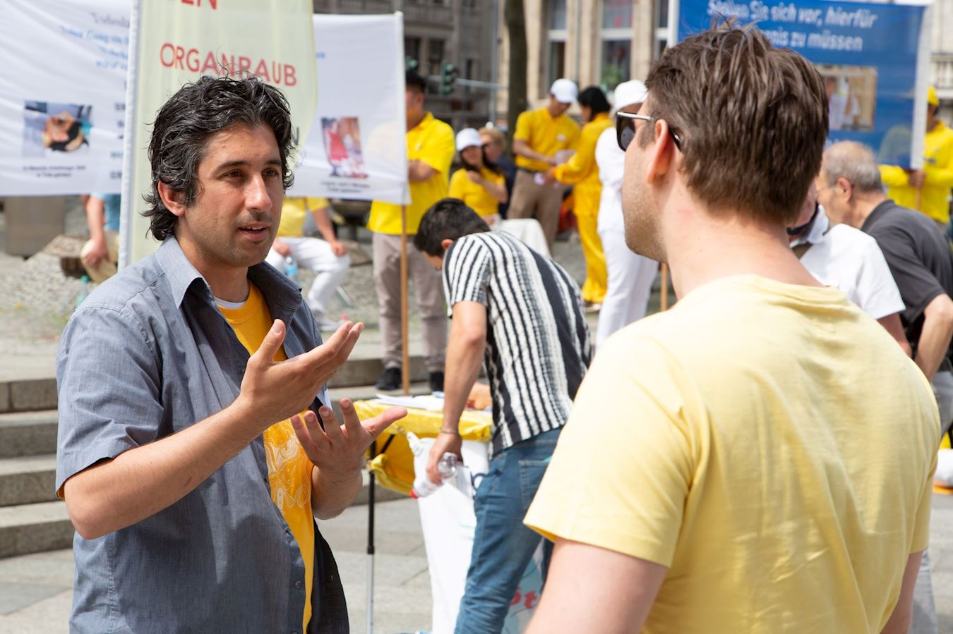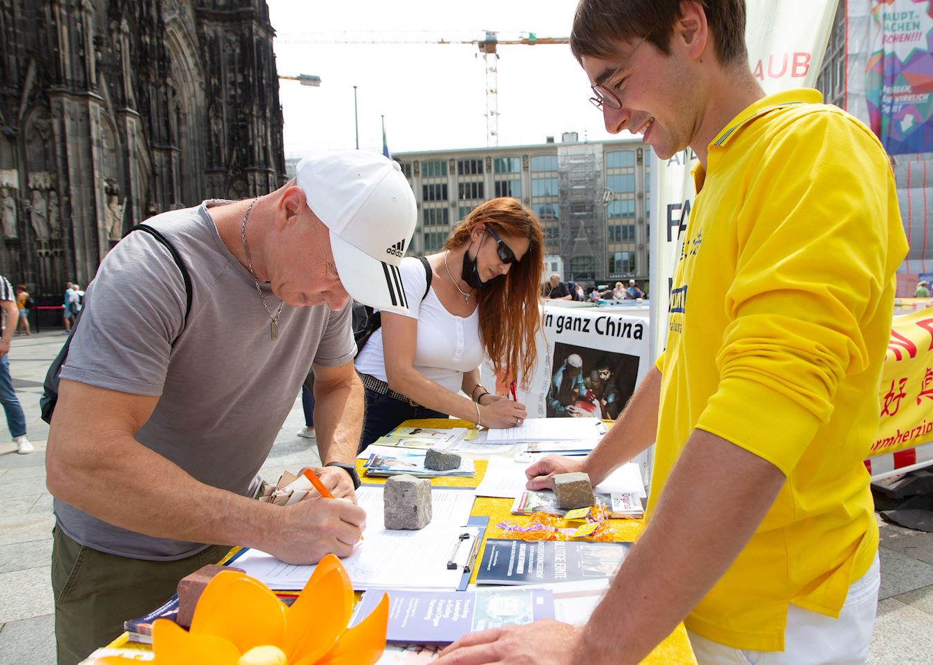活动当天,科隆天气晴朗。在大教堂前,等待参观的人群排起了长队。学员们在教堂前的广场上拉起大型横幅,并搭起了真相点。很多排队等待参观教堂的游客和路人都被学员活动吸引住了。