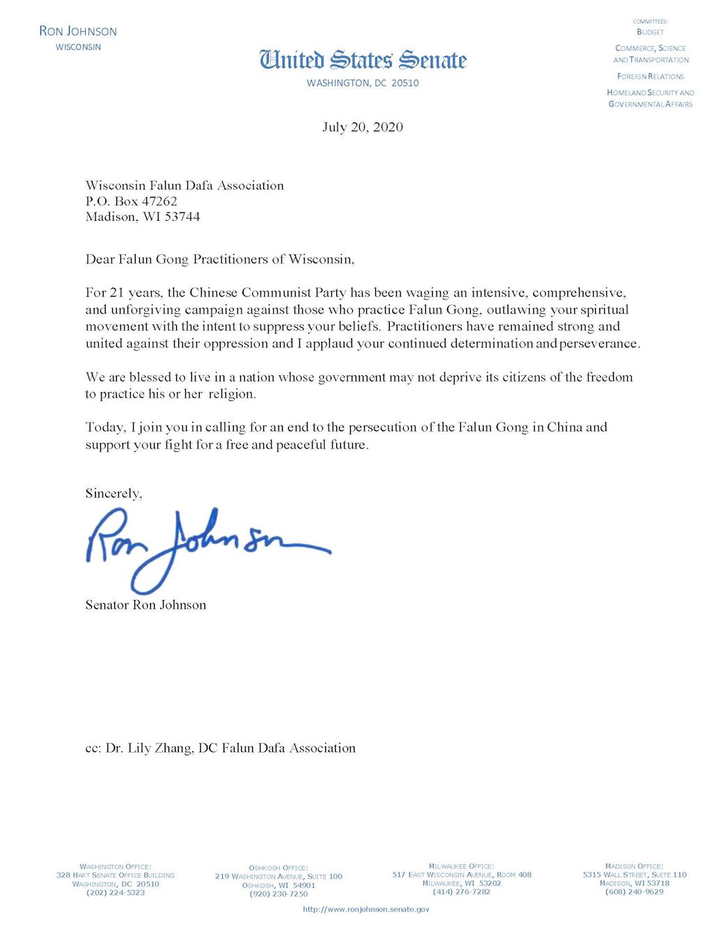 ![]() 图3:威斯康星州联邦参议员罗恩·约翰逊(Ron Johnson)写给法轮功学员的声援信。 |