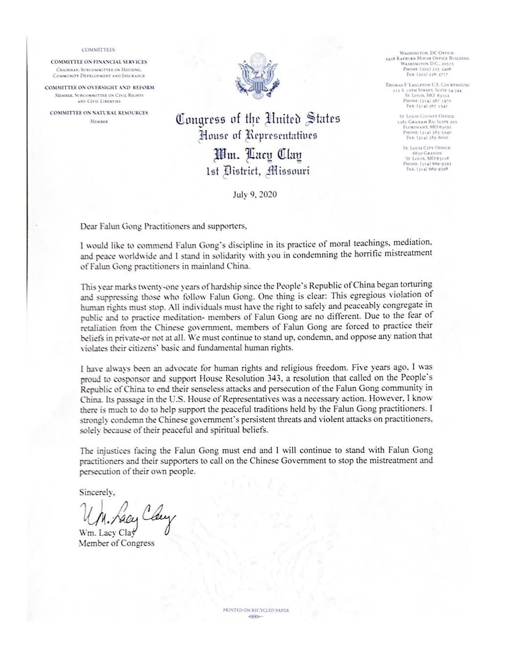 ![]() 图4:密苏里州国会众议员威廉·拉齐·克莱(William Lacy Clay)写给法轮功学员的声援信。 |
