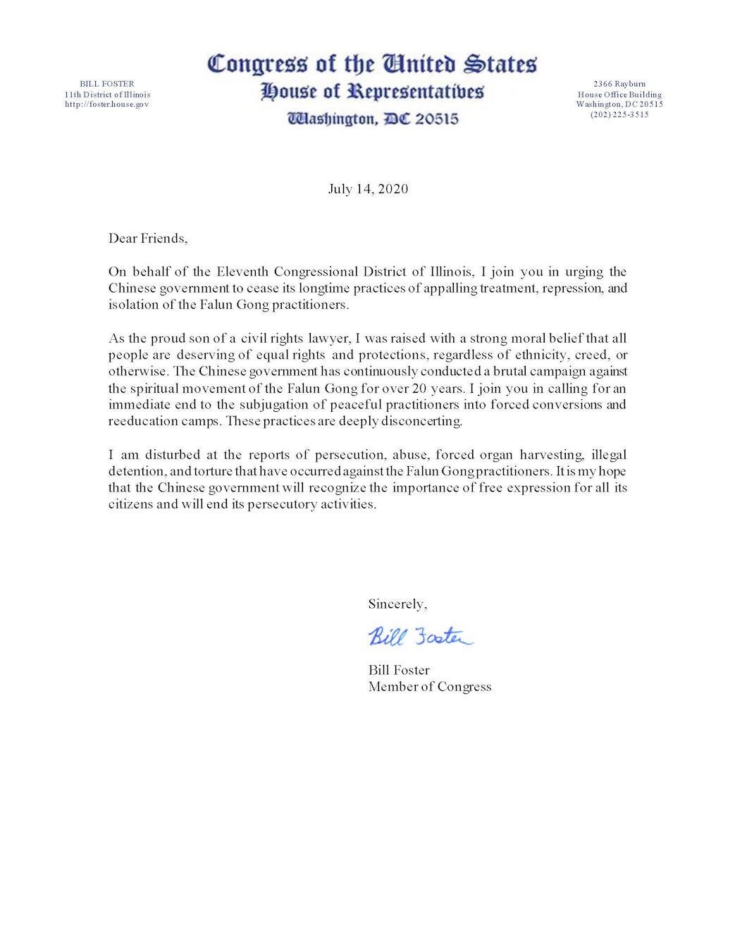 ![]() 图6:伊利诺伊州国会众议员比尔‧福斯特(Bill Foster)写给法轮功学员的声援信。 |