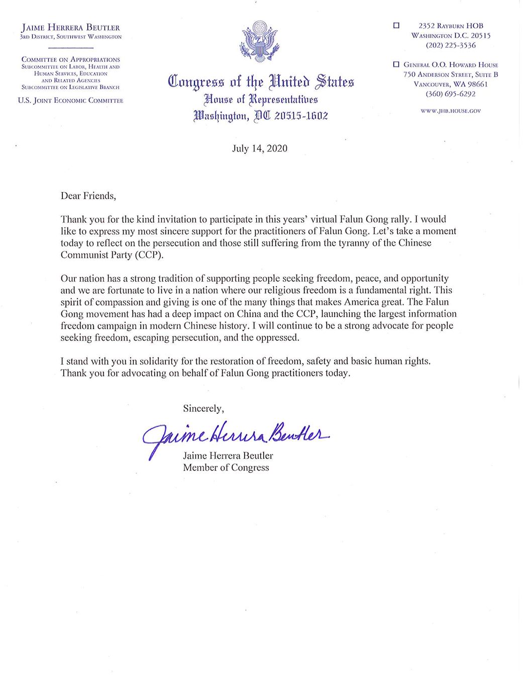 ![]() 图8:华盛顿州国会众议员洁米·赫雷拉·布特勒(Jaime Herrera Beutler)写给法轮功学员的声援信。 |