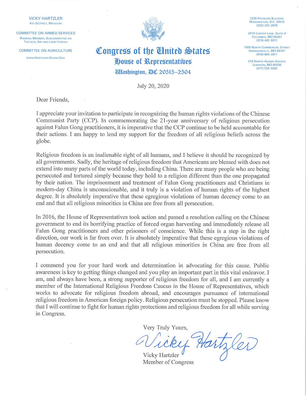 ![]() 图9:密苏里州国会众议员维琪‧哈茨勒(Vicky Hartzler)写给法轮功学员的声援信。 |