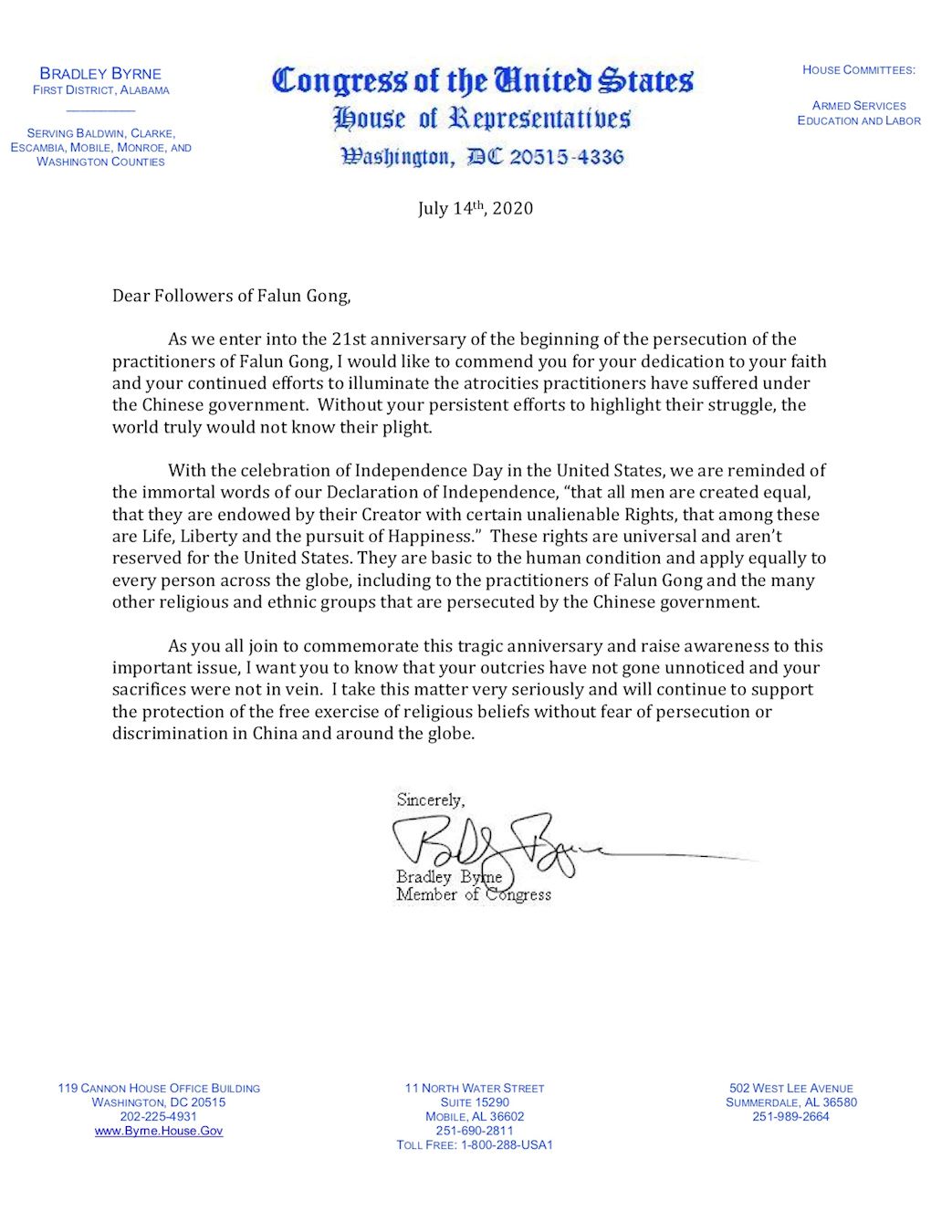![]() 图10:阿拉巴马州国会众议员布拉德利·伯恩(Bradley Byrne)写给法轮功学员的声援信。 |