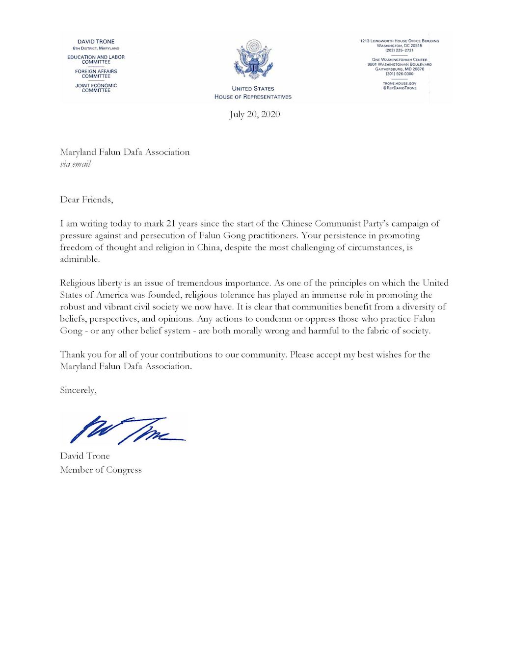 ![]() 图11:马里兰州国会众议员戴维·特朗(David Trone)写给法轮功学员的声援信。 |