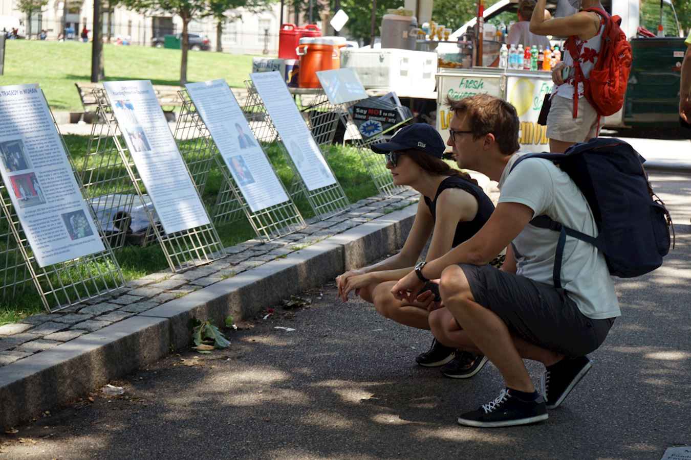 ![]() 图1~3:路人认真观看法轮功真相展板 |