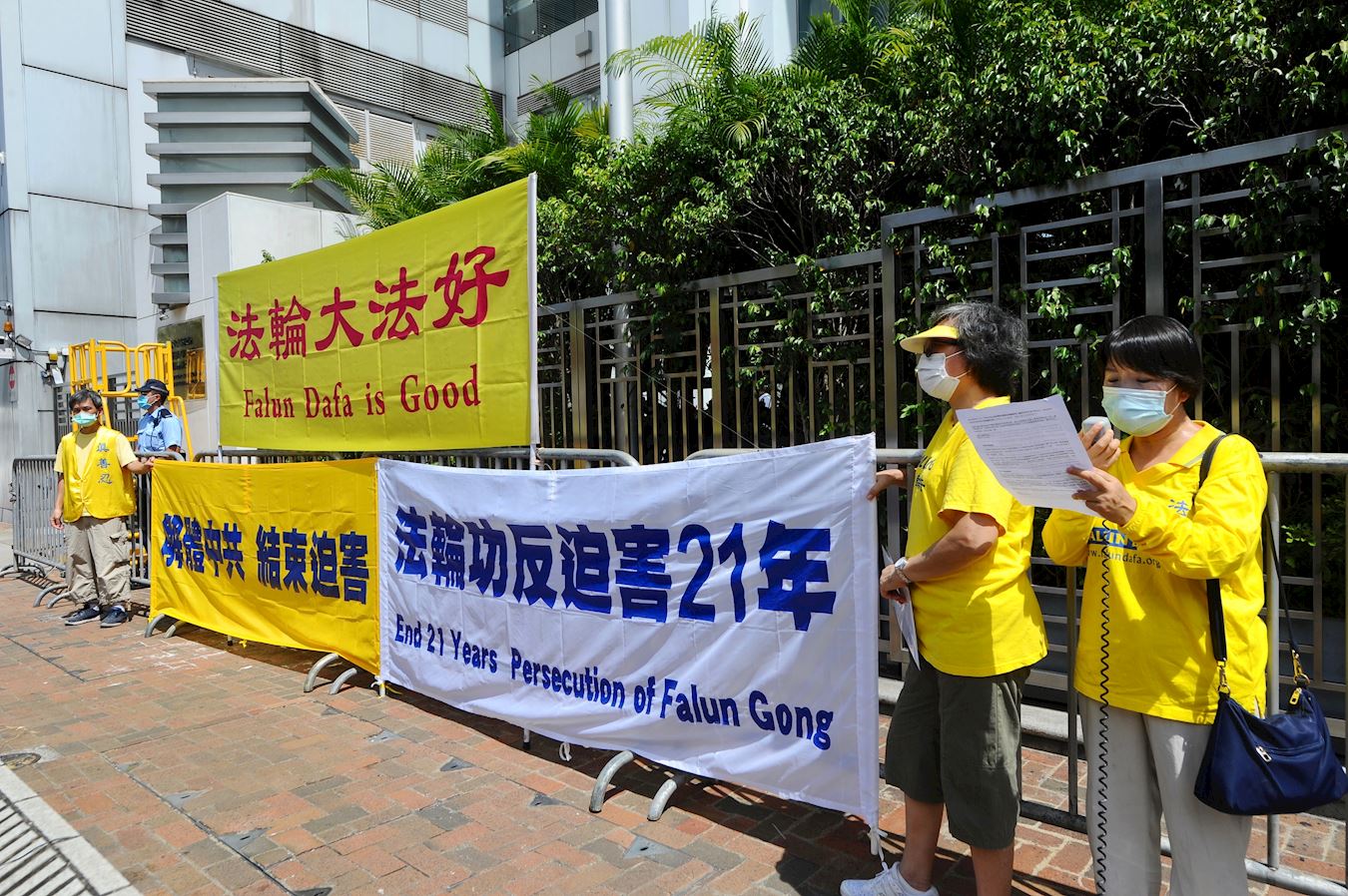 法轮功学员代表刘慧卿宣读声明,声明指中共对法轮功持续二十一年的迫害,被视为廿一世纪最深重的恐怖。面对这场前所未有的邪恶迫害,法轮功学员进行了史无前例的和平抗争。虽然中共政府强行实施“港版国安法”,但香港法轮功学员仍坚持向民众讲清真相,呼唤良知,同时呼吁解体中共、停止迫害。
