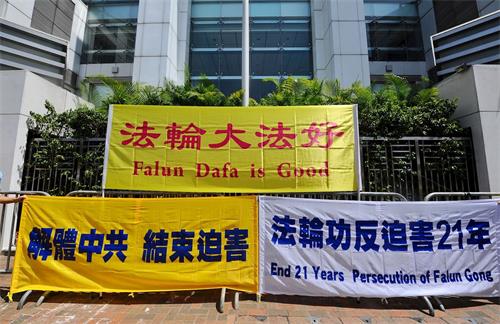 由于中共病毒再度在香港爆发,按照限聚令要求,四名法轮功学员代表,下午从中联办后门游行到正门,并在中联办前拉起“解体中共、结束迫害”、“法轮大法好”、“法轮功反迫害21年”横幅,并宣读声明,之后和平散去。
