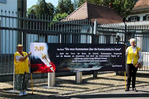 ![]() 图1~2:法轮功学员在瑞士中使馆前抗议,要求立即停止迫害。 |