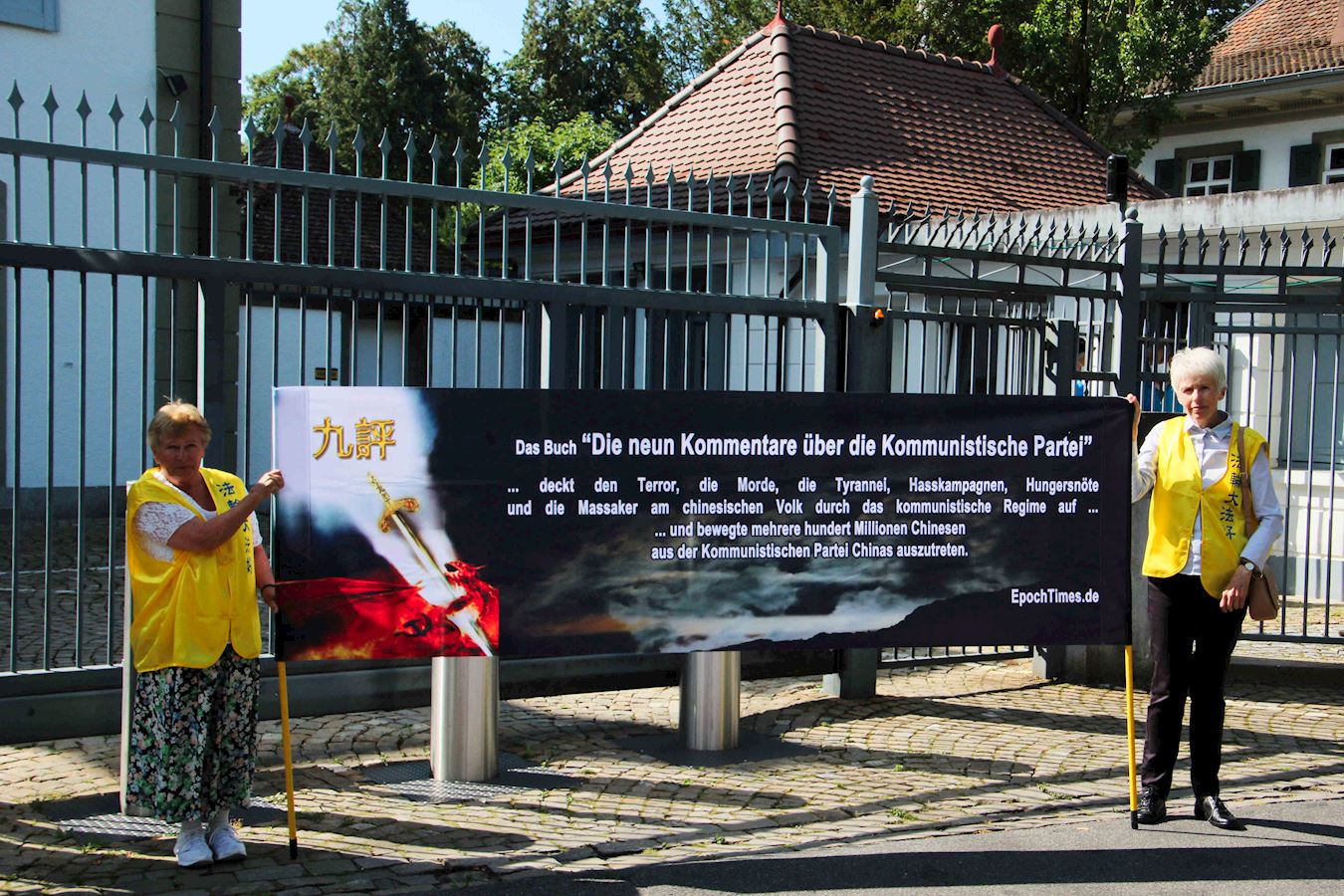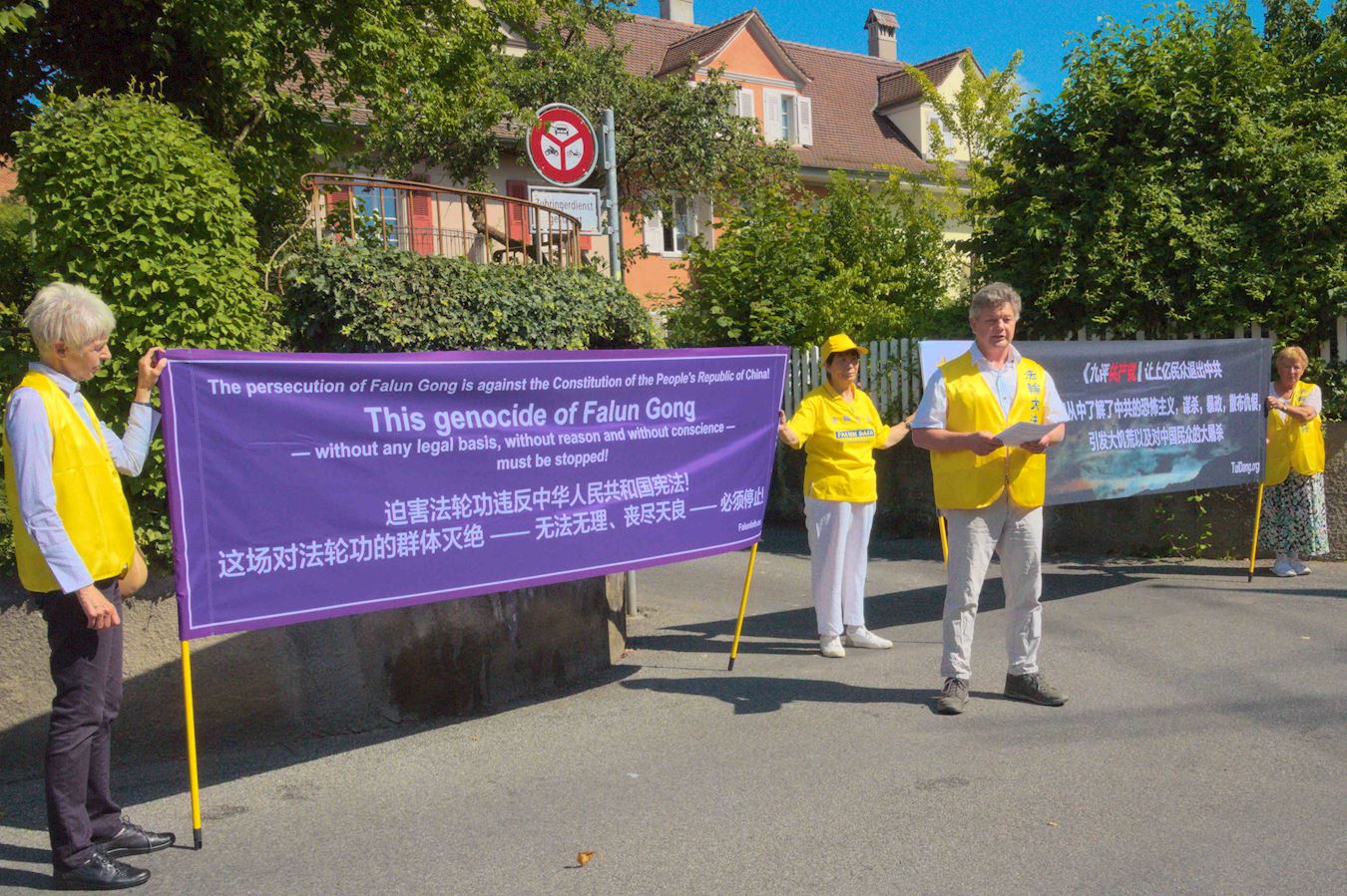 上午,部份法轮功学员代表来到中共驻瑞士使馆前,打出横幅要求中共停止迫害法轮功,并宣读了给使馆人员的公开信,希望他们在自由的国度能主动了解法轮功的真相,不再受中共谎言的欺骗,认清中共魔鬼的本性,远离中共,并可以利用自己所掌握的资讯,帮助共同制止中共对法轮功的迫害,为自己选择一个美好的未来。