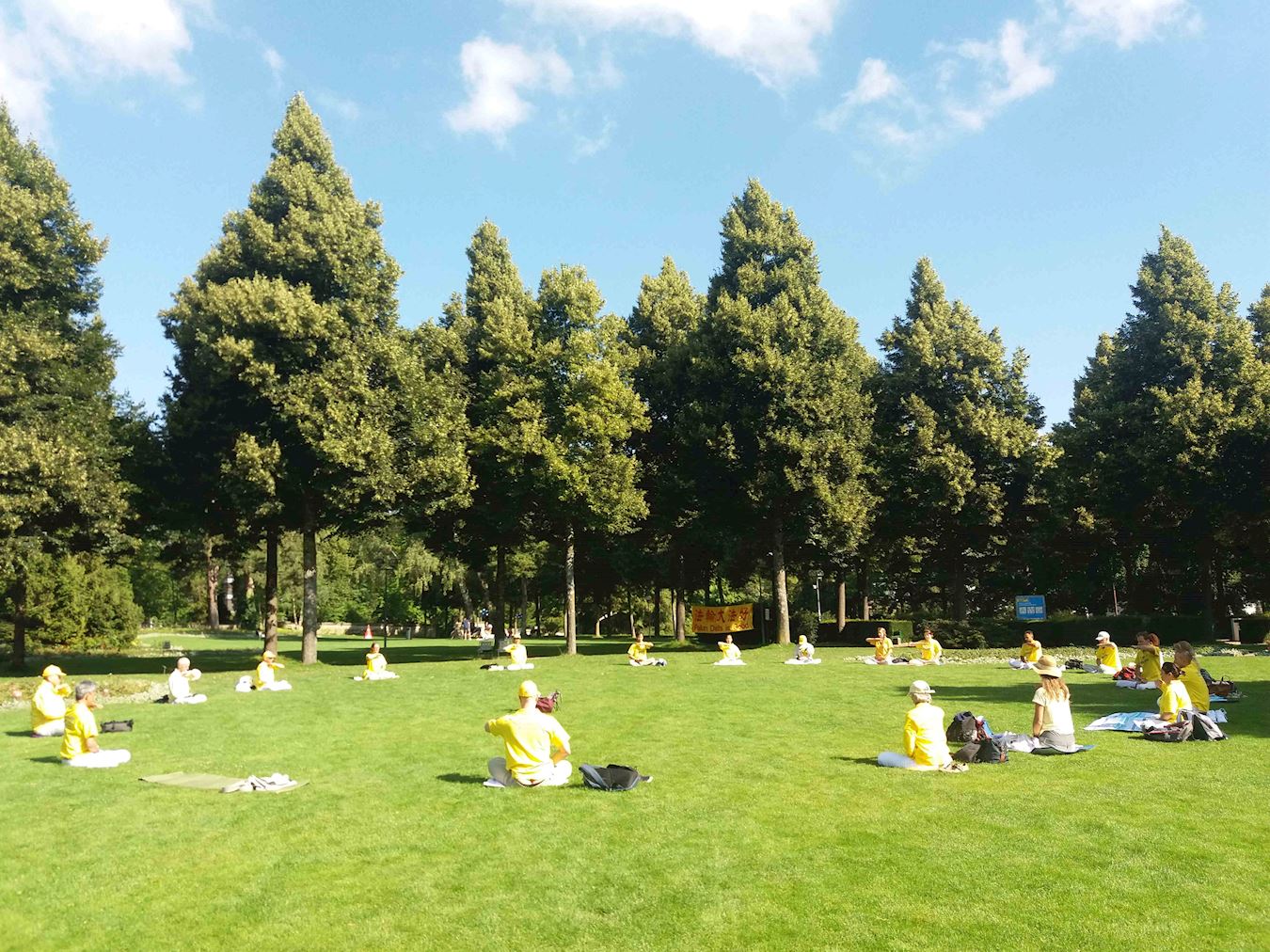 其他法轮功学员则来到伯尔尼景点玫瑰园演示功法,有的路人当时就开始学炼。
