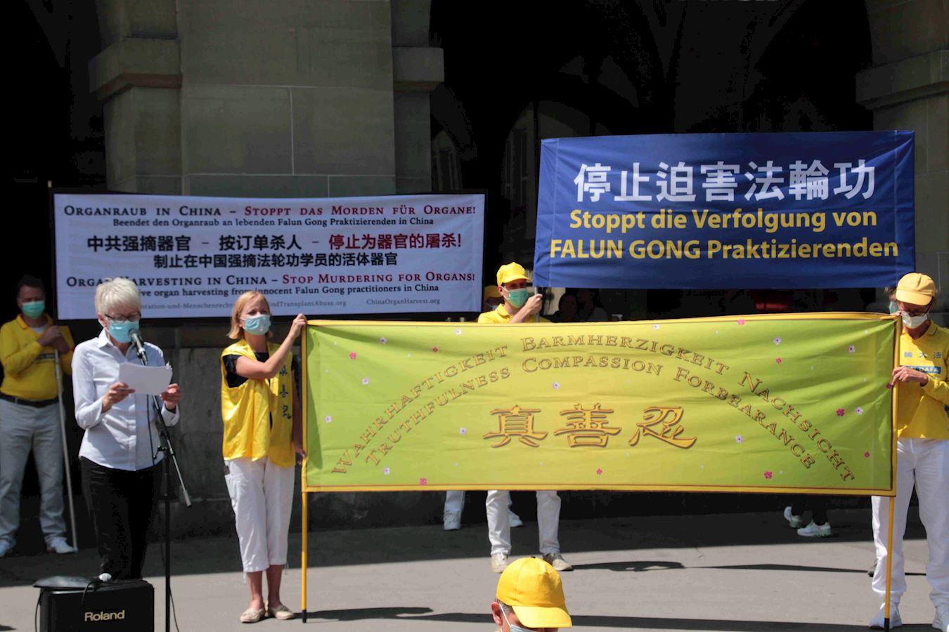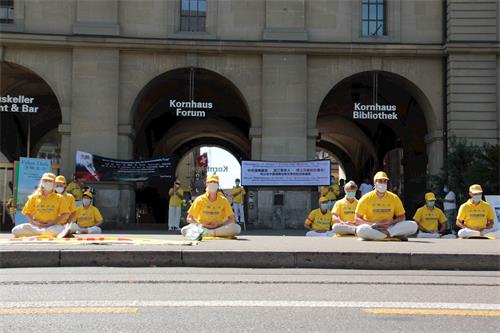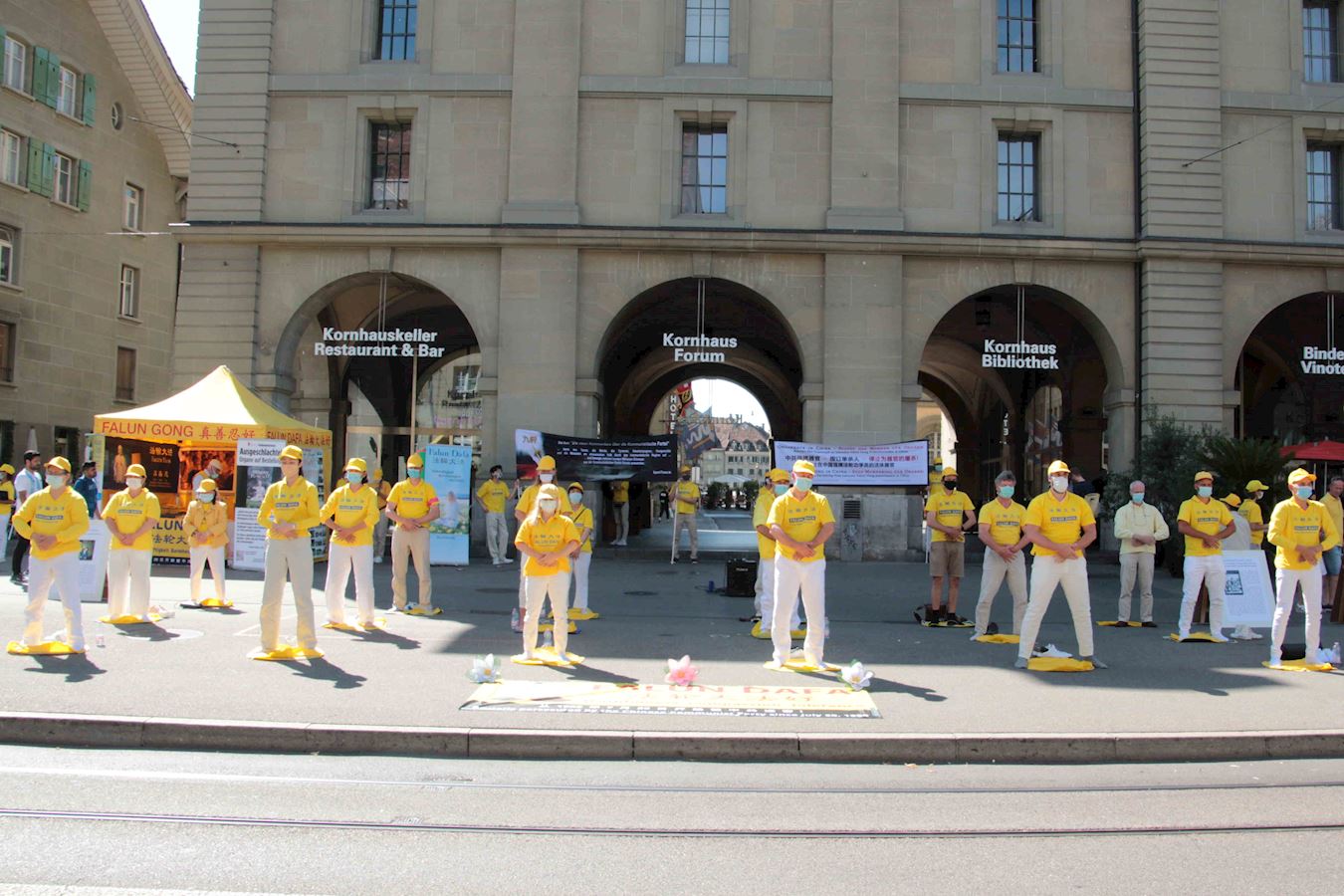 下午,法轮功学员再次聚集在首都伯尔尼市中心的Kornhaus广场,除了集体演示功法,也通过演讲告诉人们:法轮功教人按照“真善忍”做个好人,二十八年来在世界各地有越来越多的人学炼。但在过去的二十一年里却在发源地——中国遭到了中共的血腥迫害。中共惧怕上亿人以“真善忍”为准则,能自己判断好坏、对错,不易被操控,因此在二十一年前开始对法轮功学员的血腥迫害:非法关押,酷刑折磨,甚至活摘他们的器官,从中牟取暴利。