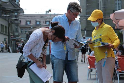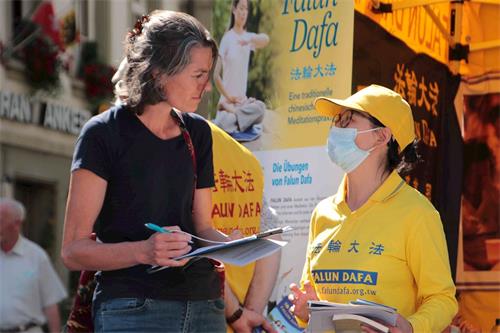 理疗师希瓦策女士(Ruth Schweizer)曾在报纸上及法轮功学员以前举办的信息日活动中了解过功法,及中共对法轮功的血腥迫害。她在签名后谈到:“每个签名都会有用,更多的签名能有更大的力量。我希望通过长期的努力能够在中国也有相应的变化。我觉得表达声援非常重要,可以让那些人(法轮功学员)了解,就算在很远的地方也有人想着他们。”