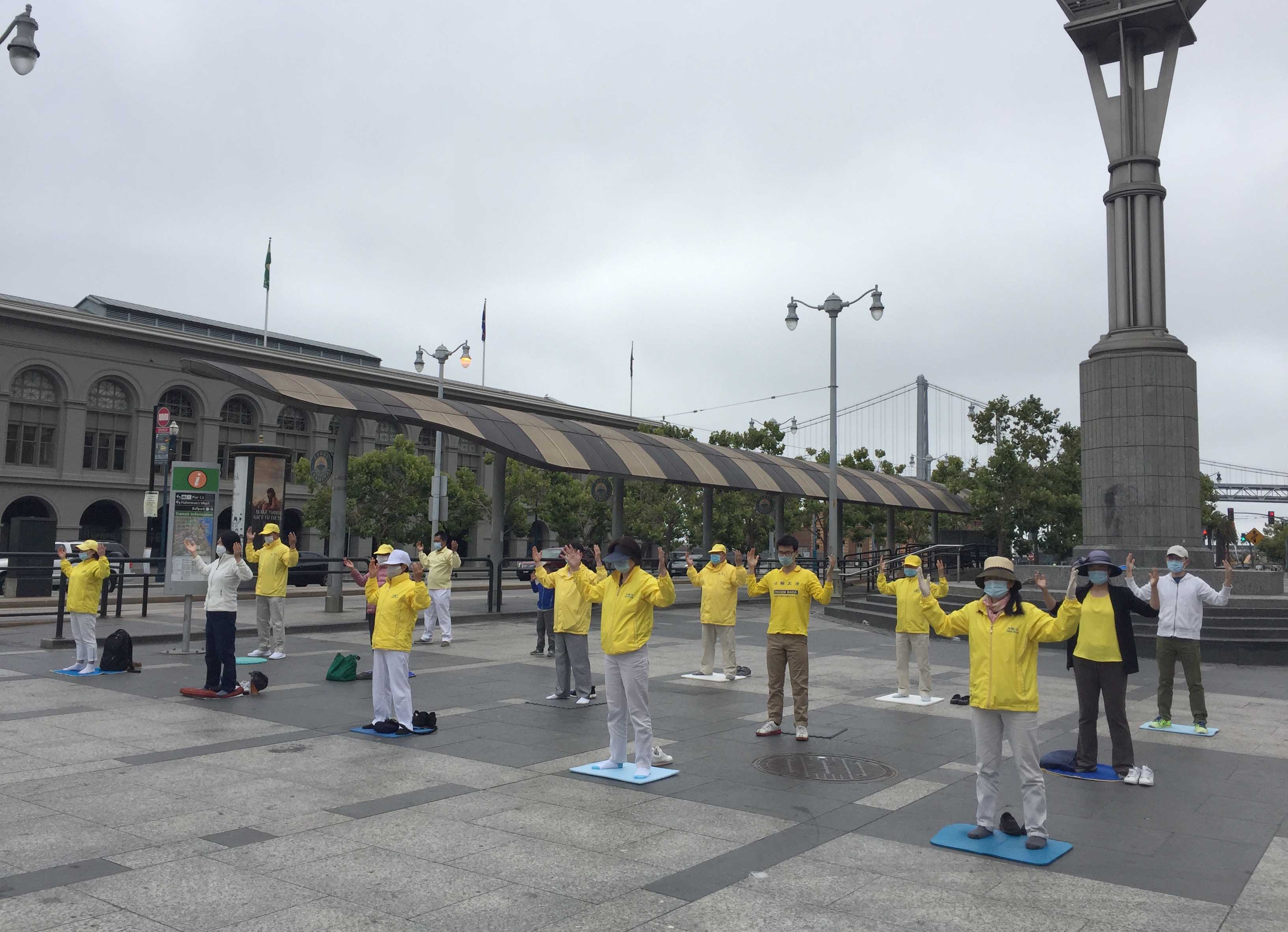 虽然受中共疫情影响,往日喧哗的渡轮大厦过往路人并不多。不过,法轮功学员集体炼功的祥和场面吸引了不少人的目光,有的自己径自走到摆放资料的桌子,取阅资料。丹尼尔和特蕾莎夫妇是居住旧金山湾区的亚裔夫妇,他们站在马路边观看法轮功学员炼功很久。
