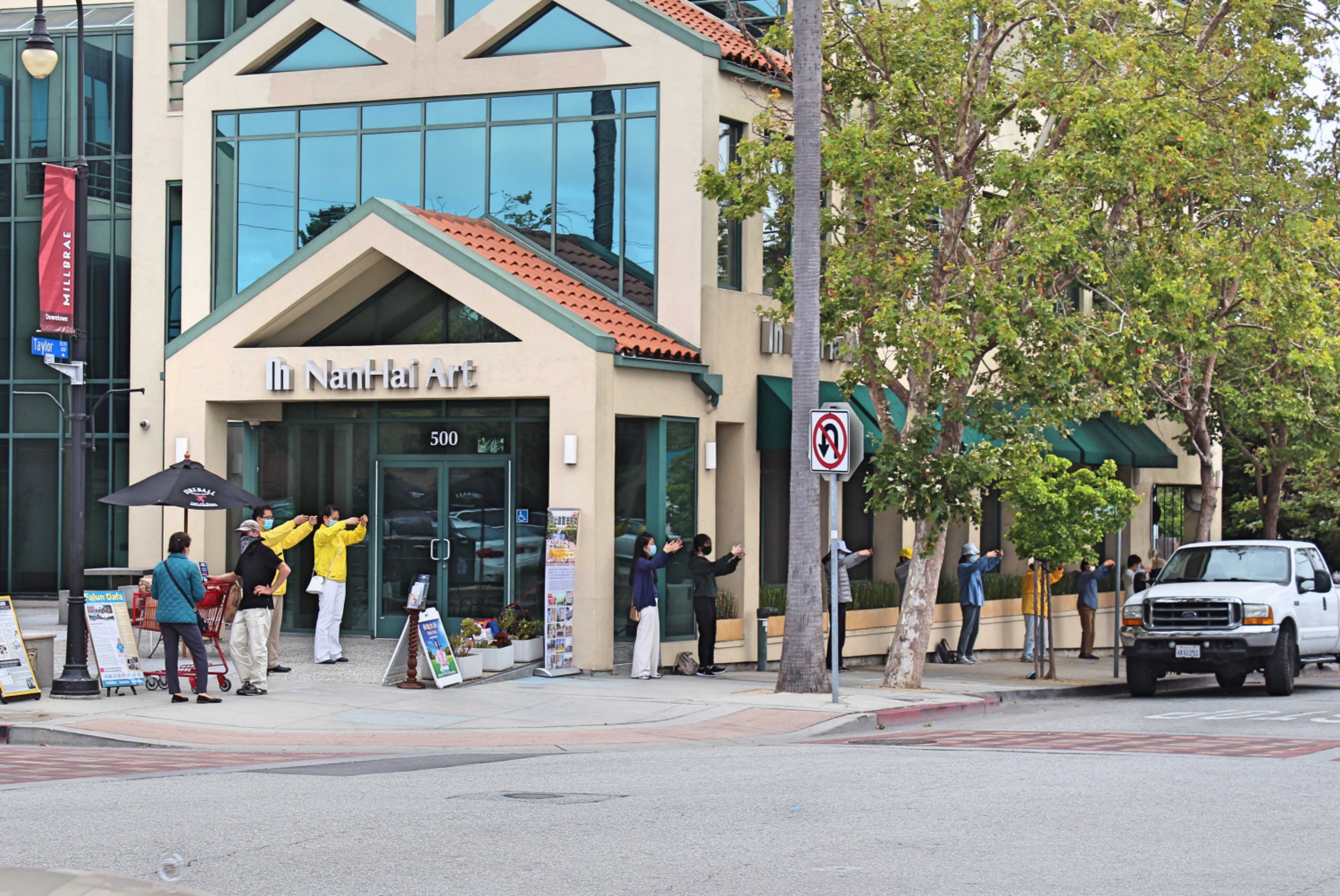 ![]() 图6~7:二零二零年七月十八日,旧金山中半岛地区的部分法轮功学员于七月十八号上午在加州米尔布雷市的繁忙商业街区(百老汇街)设立真相点,传播法轮功的真相。 |