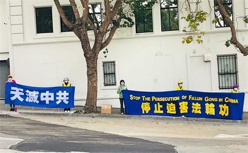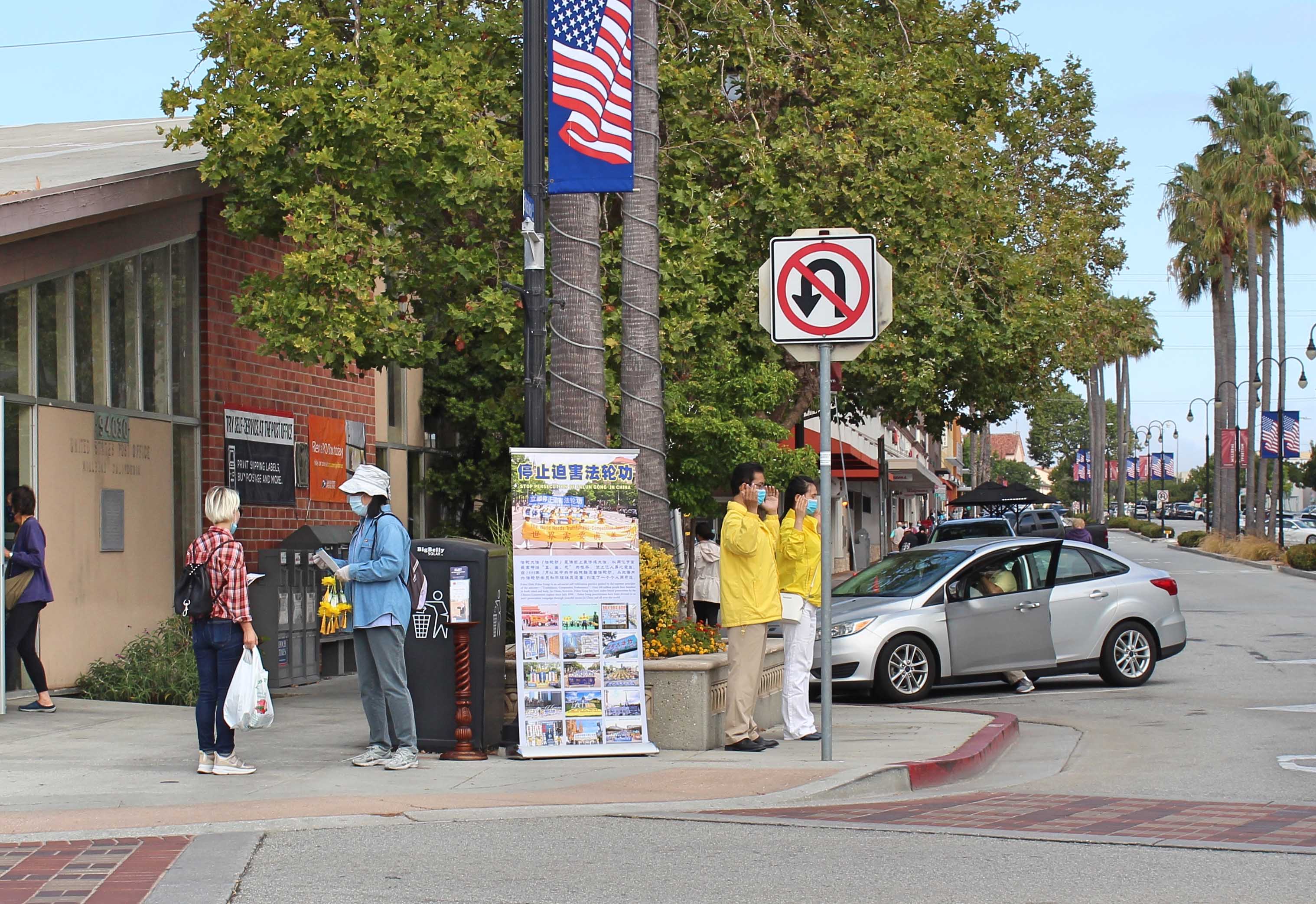 当天的活动中,法轮功学员有的演示功法,也摆放了真相展板。虽然加州受疫情的影响,商业街行人不多,还是有不少路人上去了解真相,其中有一位西方人了解真相,主动要捐款支持法轮功学员。
