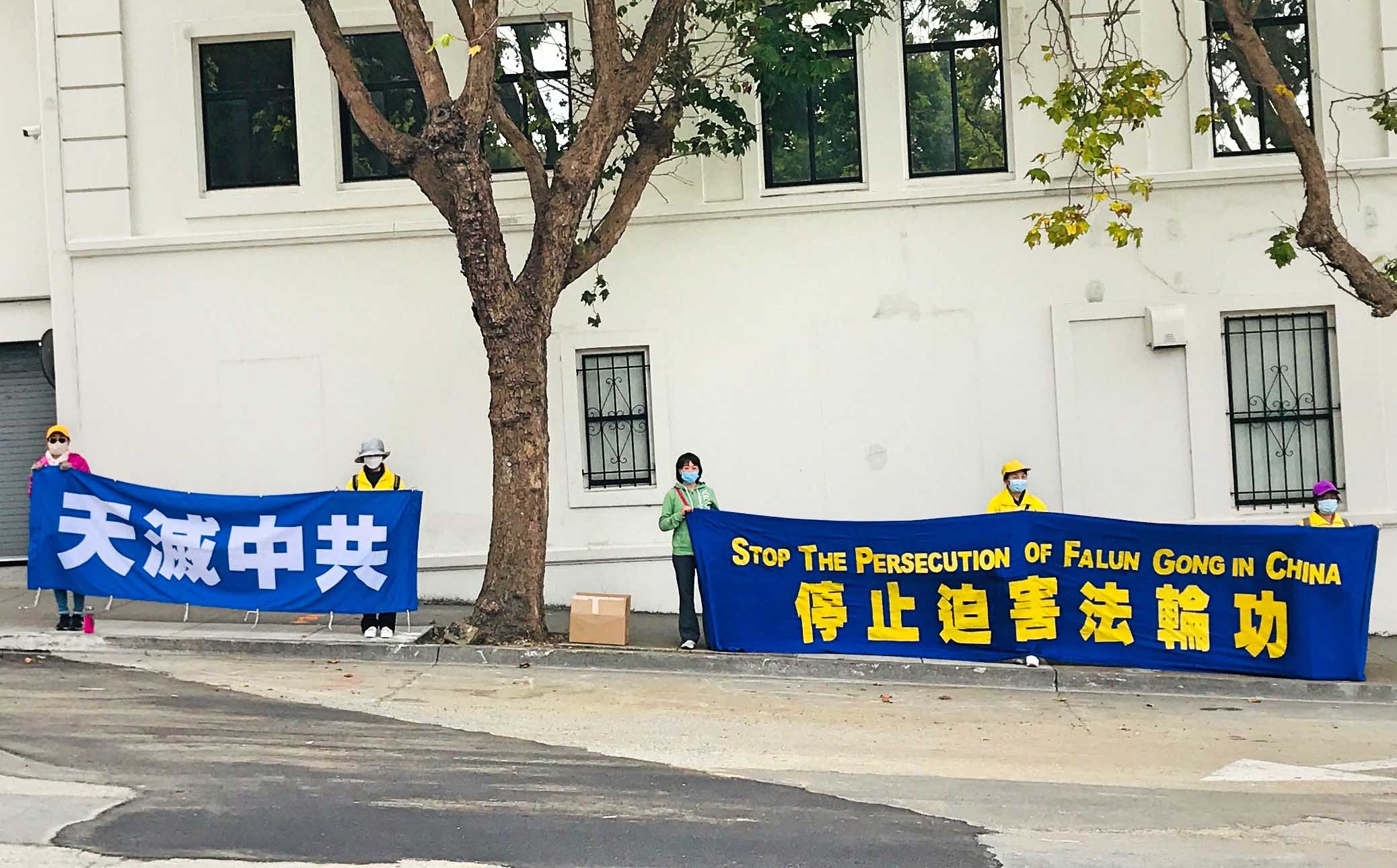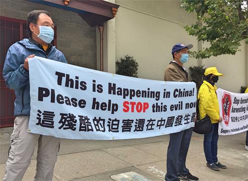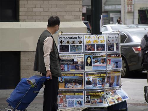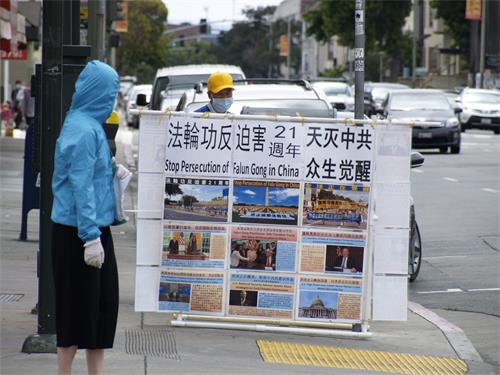 旧金山居民乔尔(Joel)一边看学员炼功,一边询问站在旁边的学员。他说:“我常常看到你们在中国城。你们非常好。我对你们的事情都很了解。现在这个迫害还在发生吗?”当学员告诉他:是的。他马上谴责中共:“中共太坏,它压制人民的信仰。当前这个病毒的大流行也是因为它欺骗掩盖,导致在全球的蔓延。”当他看到抵制中共的网站后,他说:“我一定上去签名。我们要共同抵制中共。”