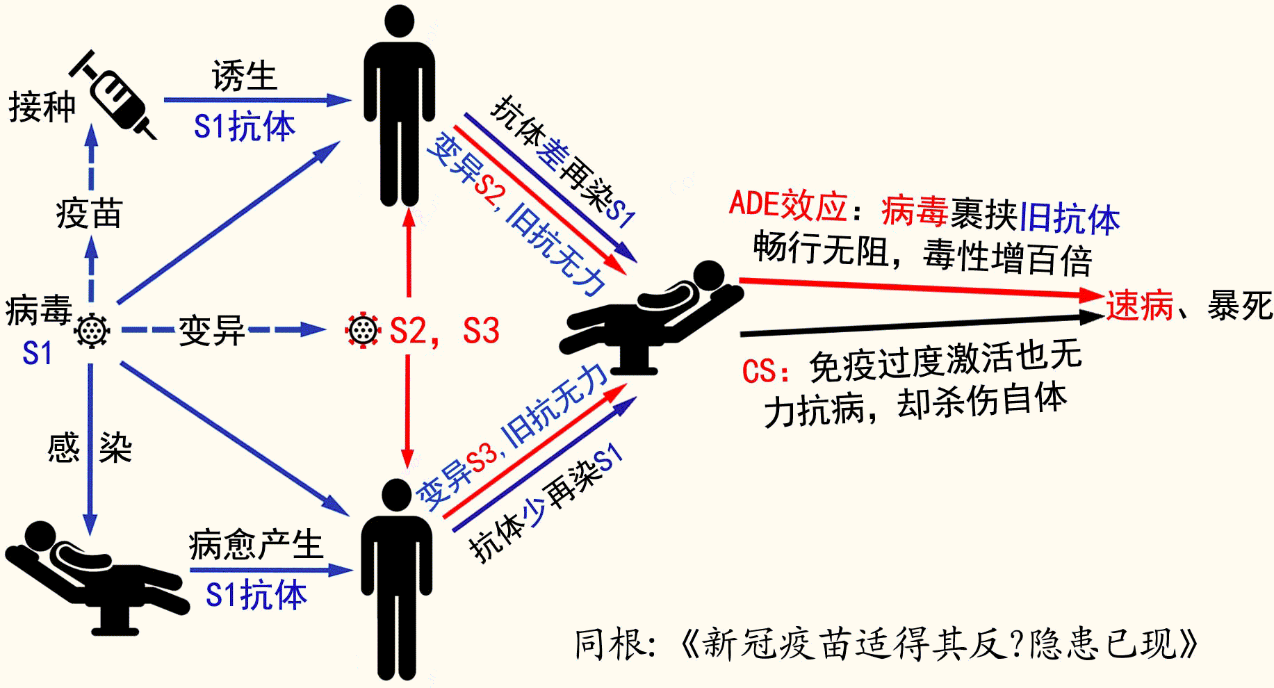 病毒S1大范围变异成S2,疫苗诱生的旧抗体A1无论怎么成功,也无效了。旧抗体和变异的S2结合很松散,锁病毒S1的“枷锁桎梏”,S2却能进出自如——手铐变成了手套,枷具变成了“面具”!戴着这个抗体A1面具,A1-S2在细胞间畅行无阻,病毒S2进入细胞内蚕食。因为ADE效应,免疫系统把“面具”下的病毒当作了自己人,打疫苗者一直没产生病态反应,等身体被病毒侵蚀到支撑不住时,骤然崩溃,导致迅速危重,不治而死。