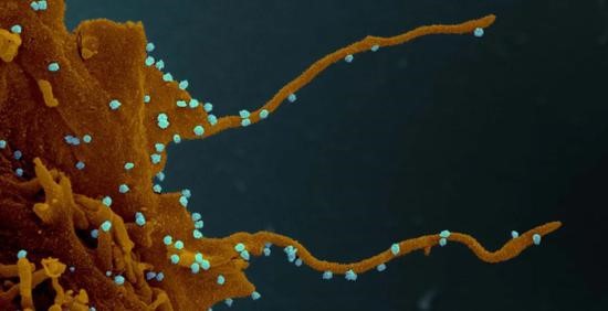 ![]() 图2:细胞被武汉肺炎(新冠病毒)感染后形成大量释放病毒的伪足(示意图,白色颗粒示病毒颗粒,图片自Elizabeth Fischer, Microscopy Unit NIH/NIAID.) |
