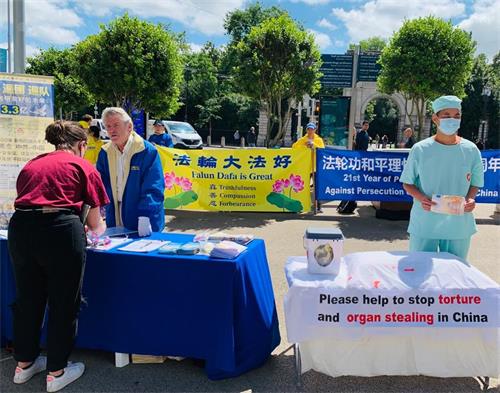 法轮功学员打出“法轮功和平理性反迫害21周年”、“中共是最邪恶的病毒 祸害全世界”等横幅,向世人传递真相。