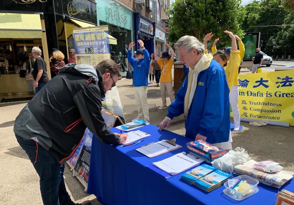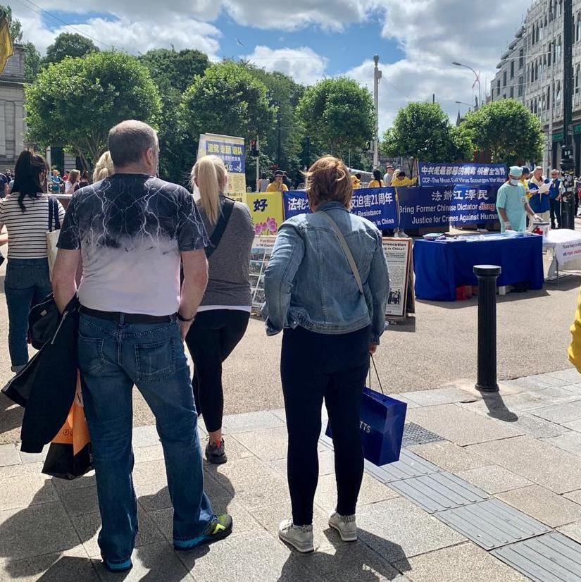 爱尔兰仍在为防范中共病毒疫情而执行社交距离,但依然有不少行人停下来观看真相展板,在制止迫害的签名表上留下名字和联系方式。