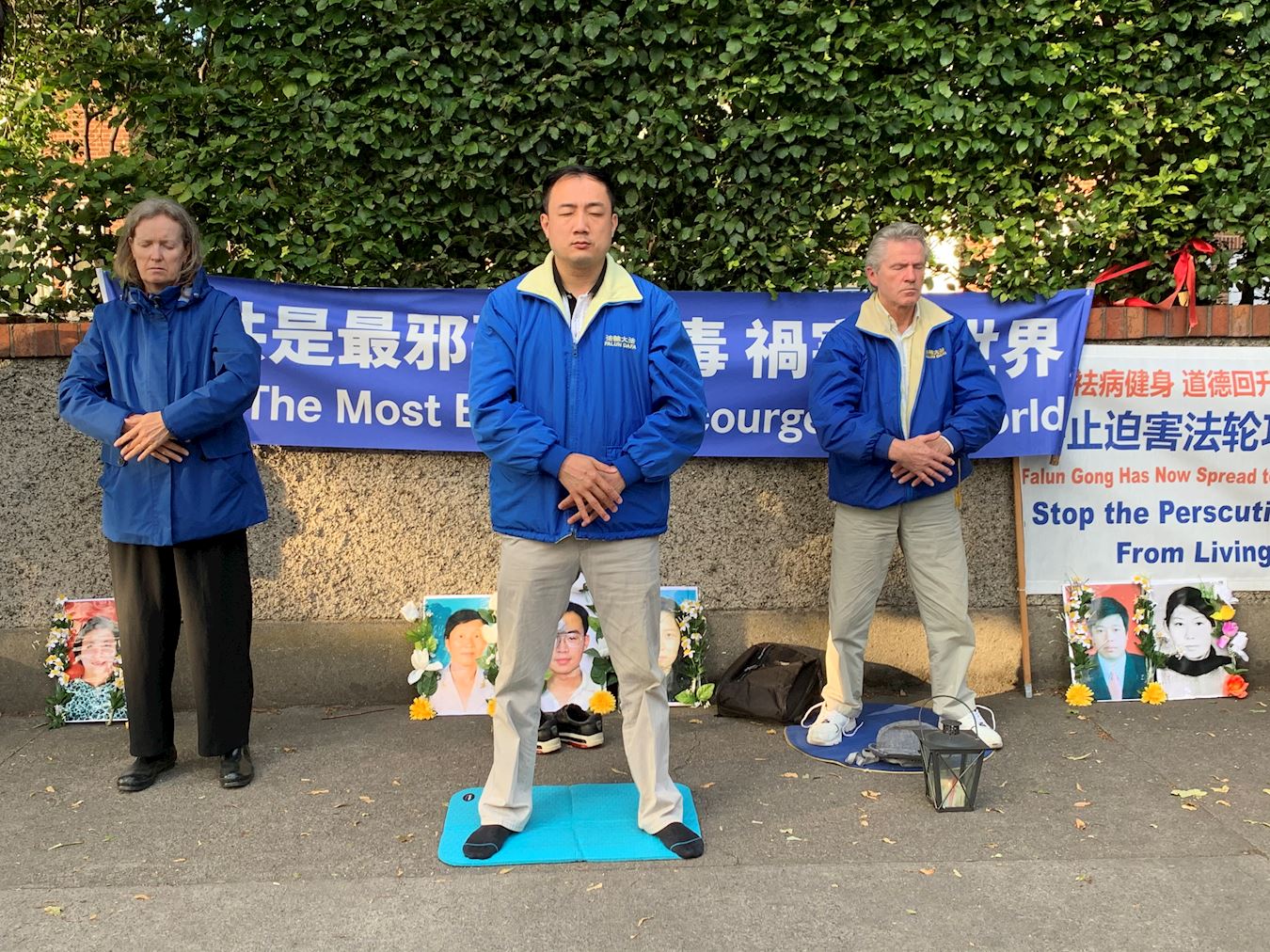 7月20日晚,爱尔兰法轮功学员来到中使馆前,举行烛光守夜,悼念21年来被迫害致死的中国大陆同修,要求中共立即停止迫害。