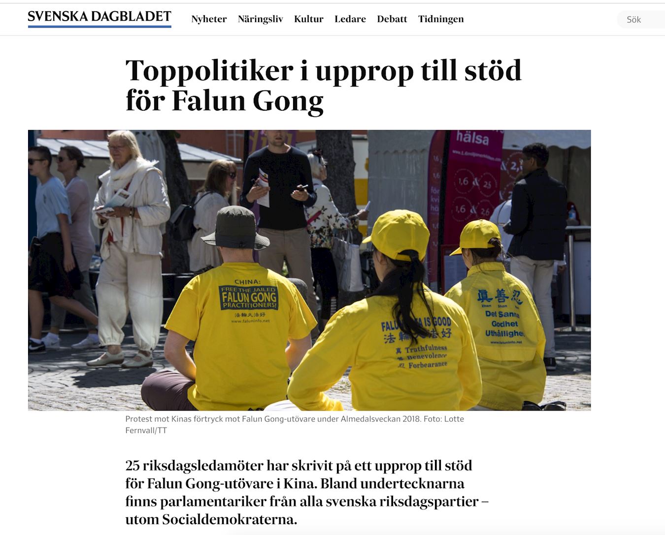 ![]() 图5:瑞典第二大日报瑞典日报(SvD)以“顶级政要呼吁声援法轮功”为标题报导了联合声明。 |