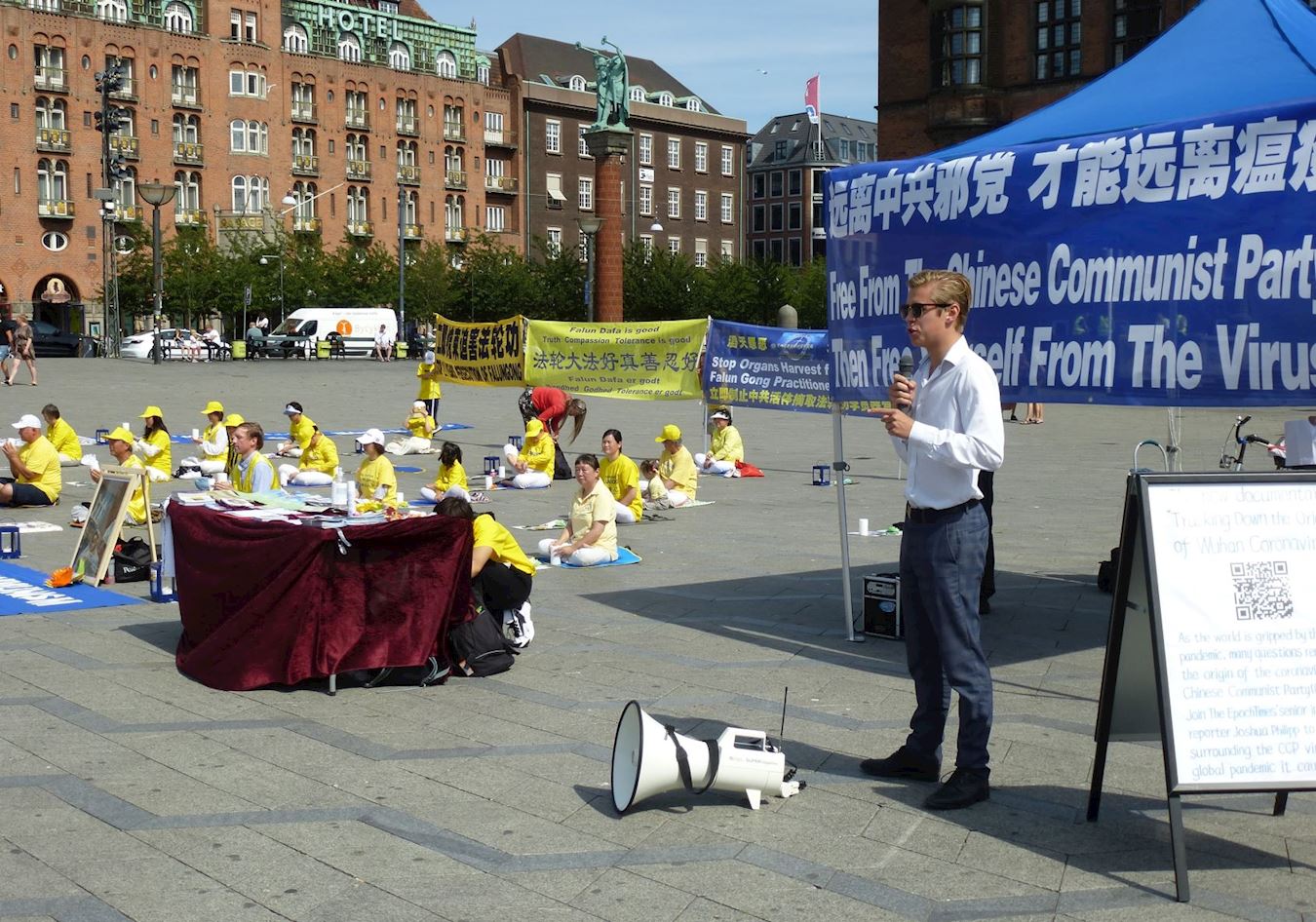 当天,丹麦人权组织“谴责中国(中共)”(Kinakritik)的主席托马斯。偌登(Thomas Rohden )前来参加法轮功学员的活动,他说:“我们现在看到的是中共企图摧毁全世界自由的开始。中共毫不在意人的生命。我们看到,法轮功学员的器官被中共盗卖到全世界。我们看到,新疆维吾尔人被中共送进了集中营。但是我们丹麦人却不知道这些血淋淋的事实!”