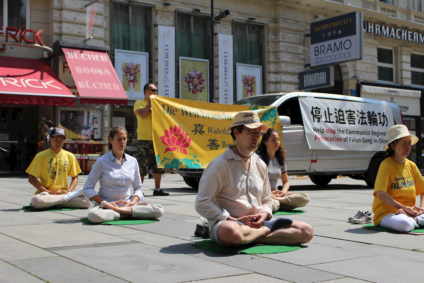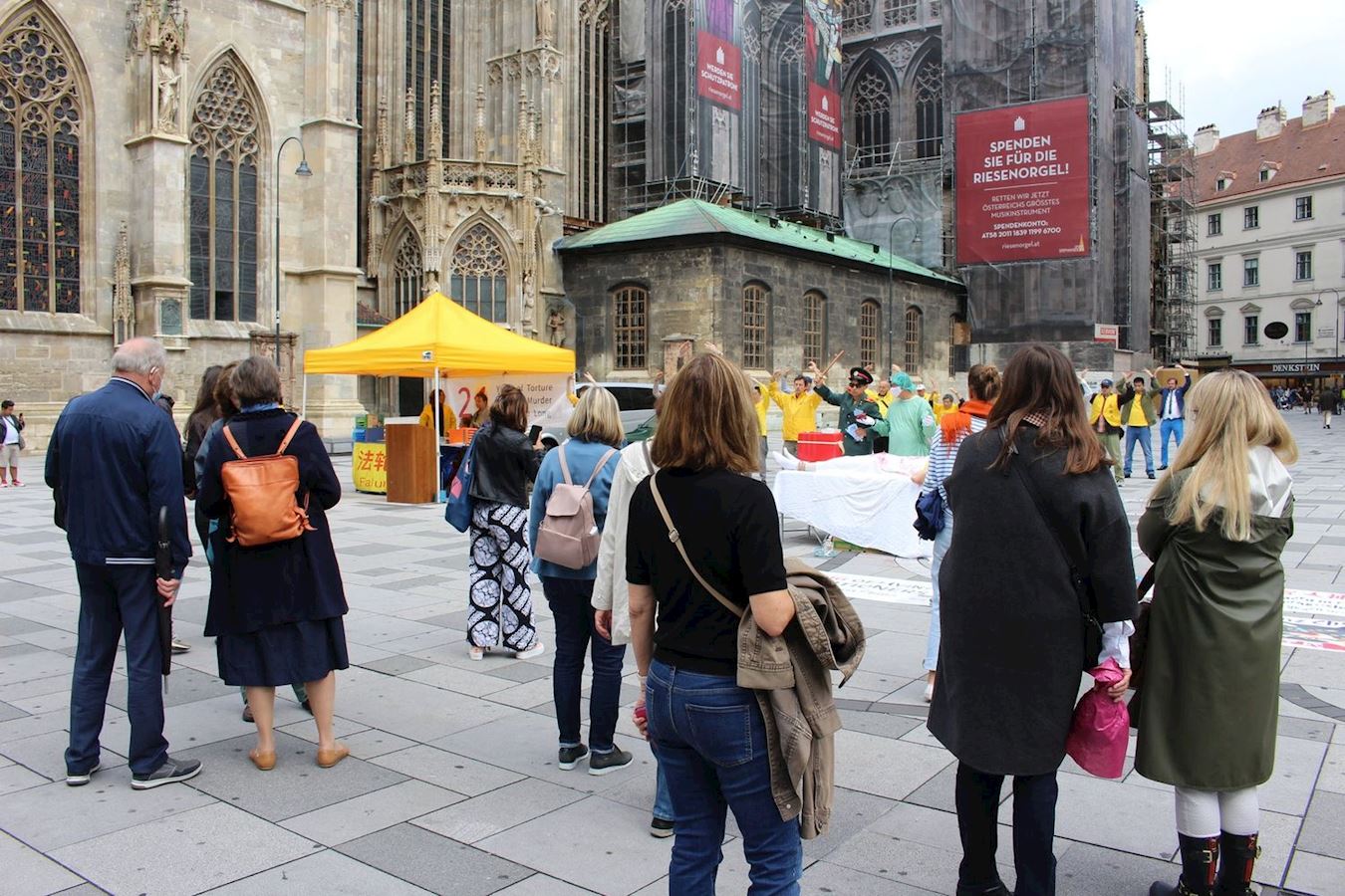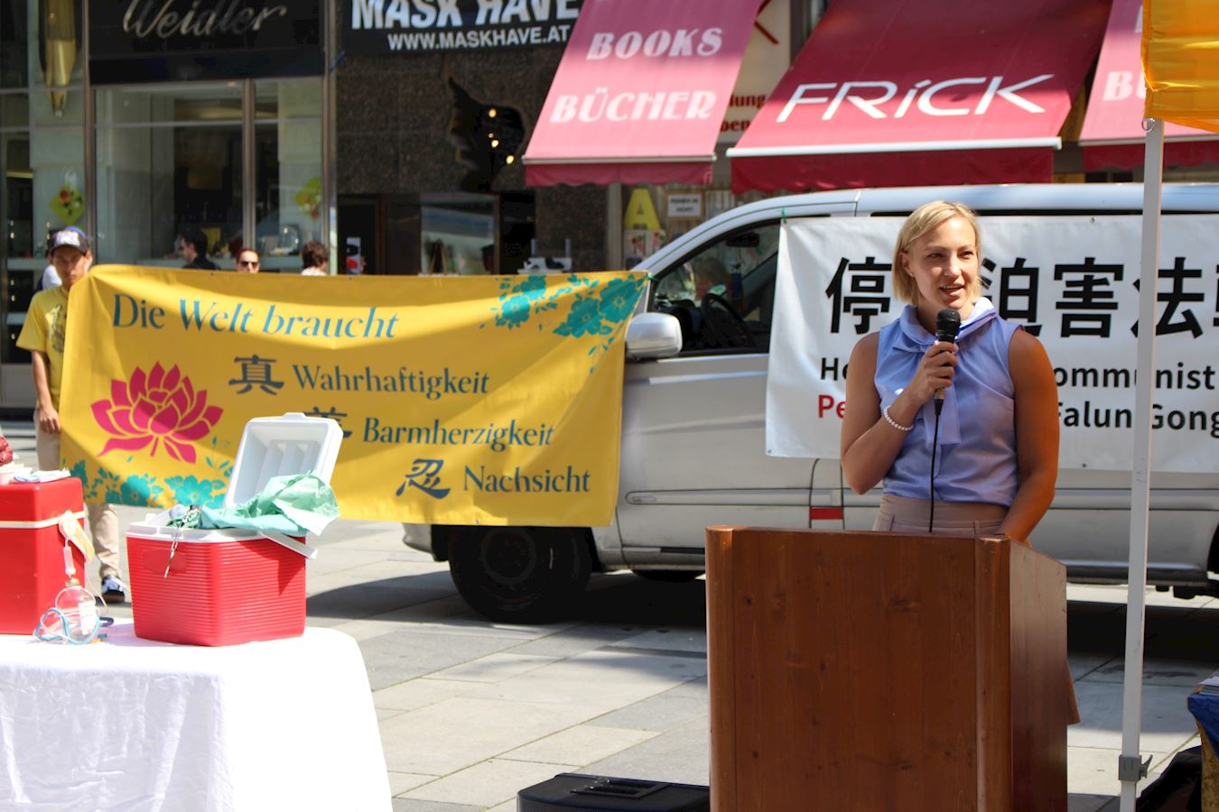 七月二十一日,维也纳市议员亨格朗德女士(Hungerländer)来到格拉本大街加入学员活动,并现场致词。她说到:“人权是绝对(需要保障)的,因为人的尊严和人的痛苦在世界所有地方和所有政府下都是一样的。”许多民众都被学员的活动吸引,人们谴责中共的暴行,并纷纷为反迫害签名。