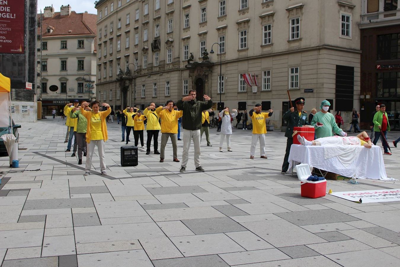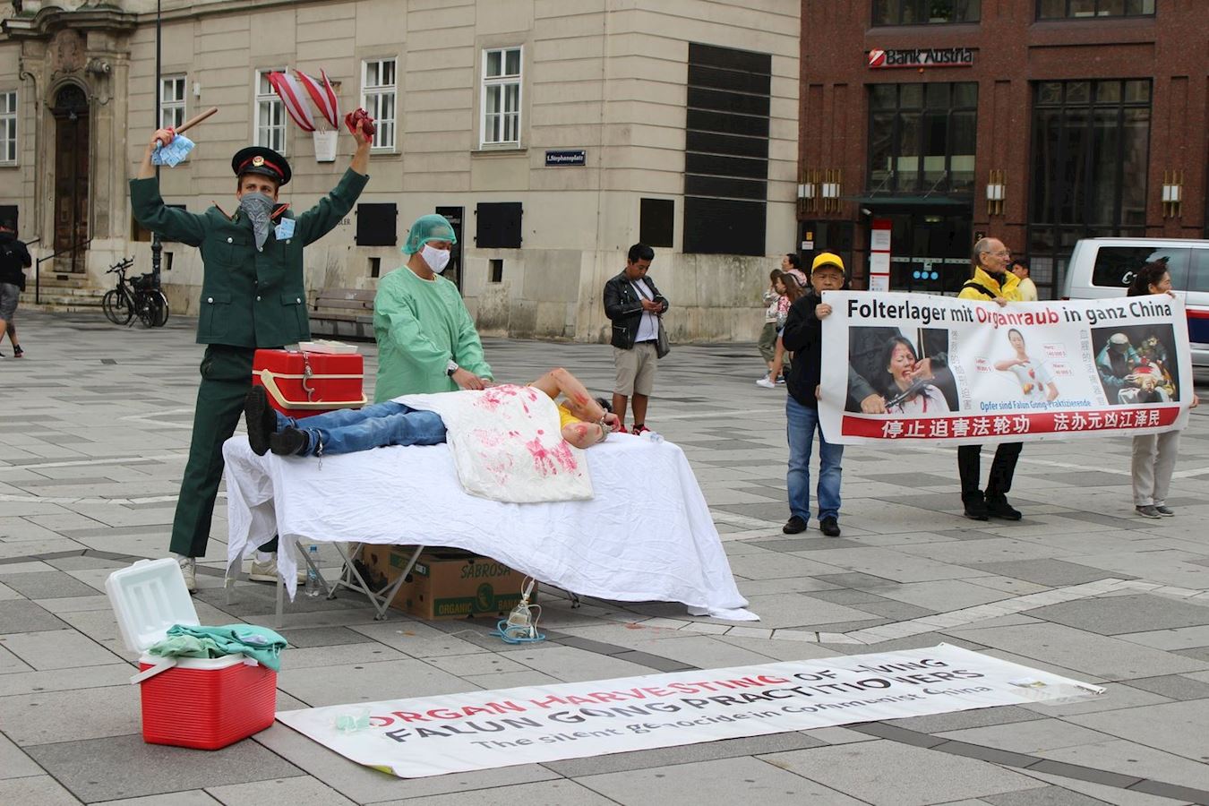 奥地利法轮功学员在纪念反迫害21周年的活动里,不仅在现场演示功法并征集签名,学员们还为民众表演了中共活摘器官的罪行。通过演讲学员们向民众讲述了中共迫害的真相。学员们的活动吸引了很多民众的注意。不少人表示活摘器官的暴行“实在太可怕了”。很多人都表示希望迫害能早日停止。