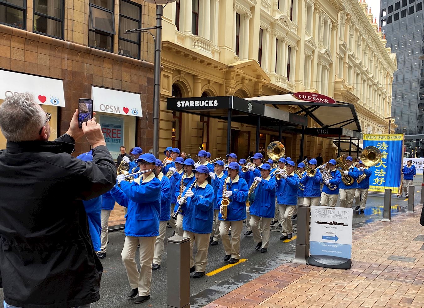 浩浩荡荡的游行队伍一眼望不到头,天国乐团动听而又雄壮的乐曲声吸引了无数民众,令原本匆匆赶路的人们也纷纷驻足,掏出手机录影或拍摄,并开心地接过法轮功学员递给他们的真相传单。