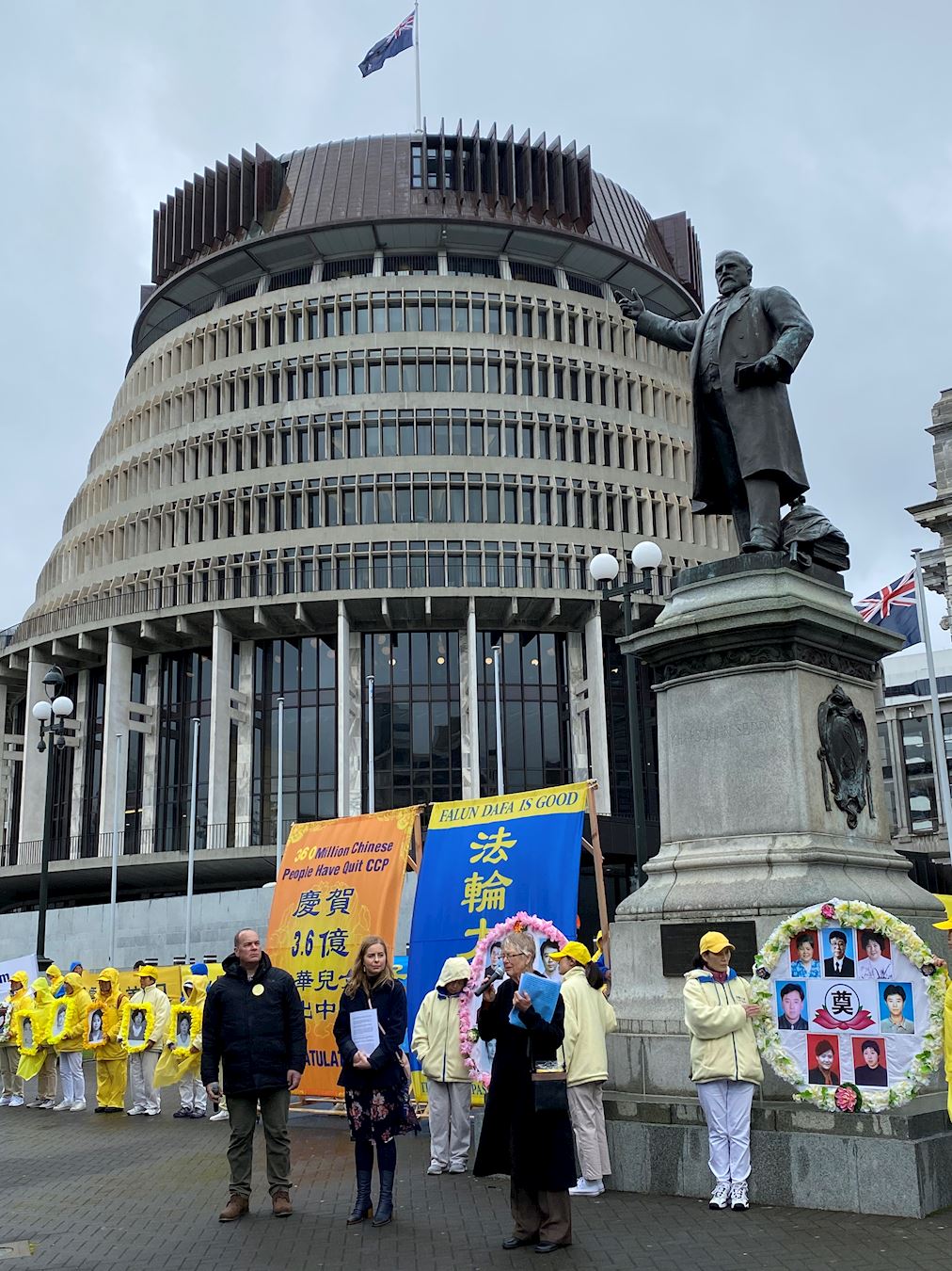 下午时分,游行队伍抵达了新西兰国会大厦,四名法轮功学员在国会门前集会上发言,讲述他们在中国遭受的迫害,并呼吁善良的人们和各国政府能选择正义,呵护善良。两位议员到场支持并发表演讲。