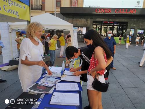 中共对法轮功的迫害罪行让西班牙民众感到震惊,许多民众前来声援,并在征签簿上签字。