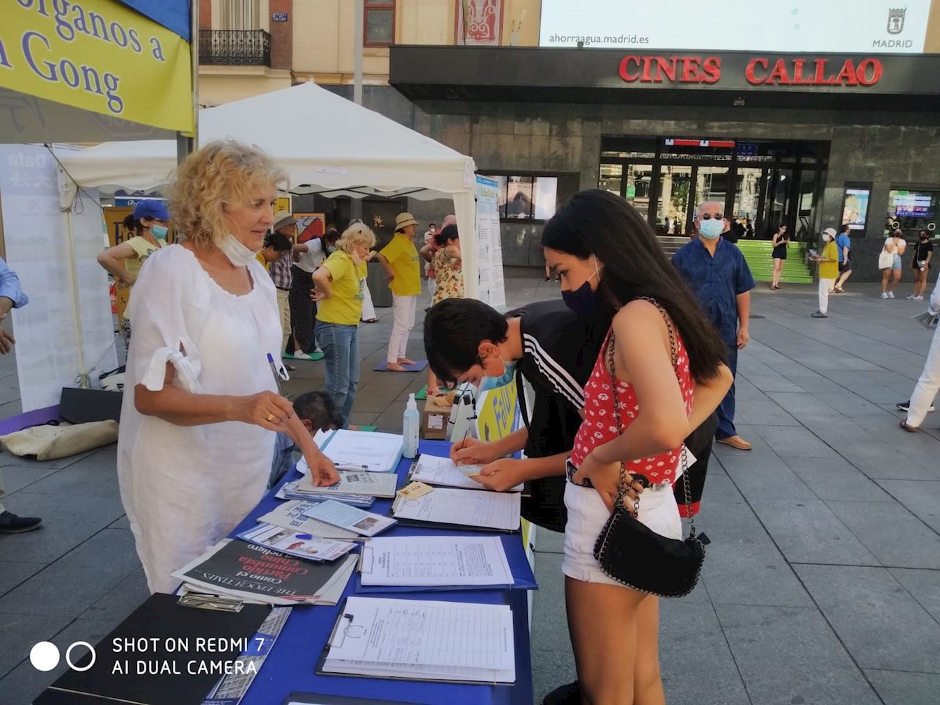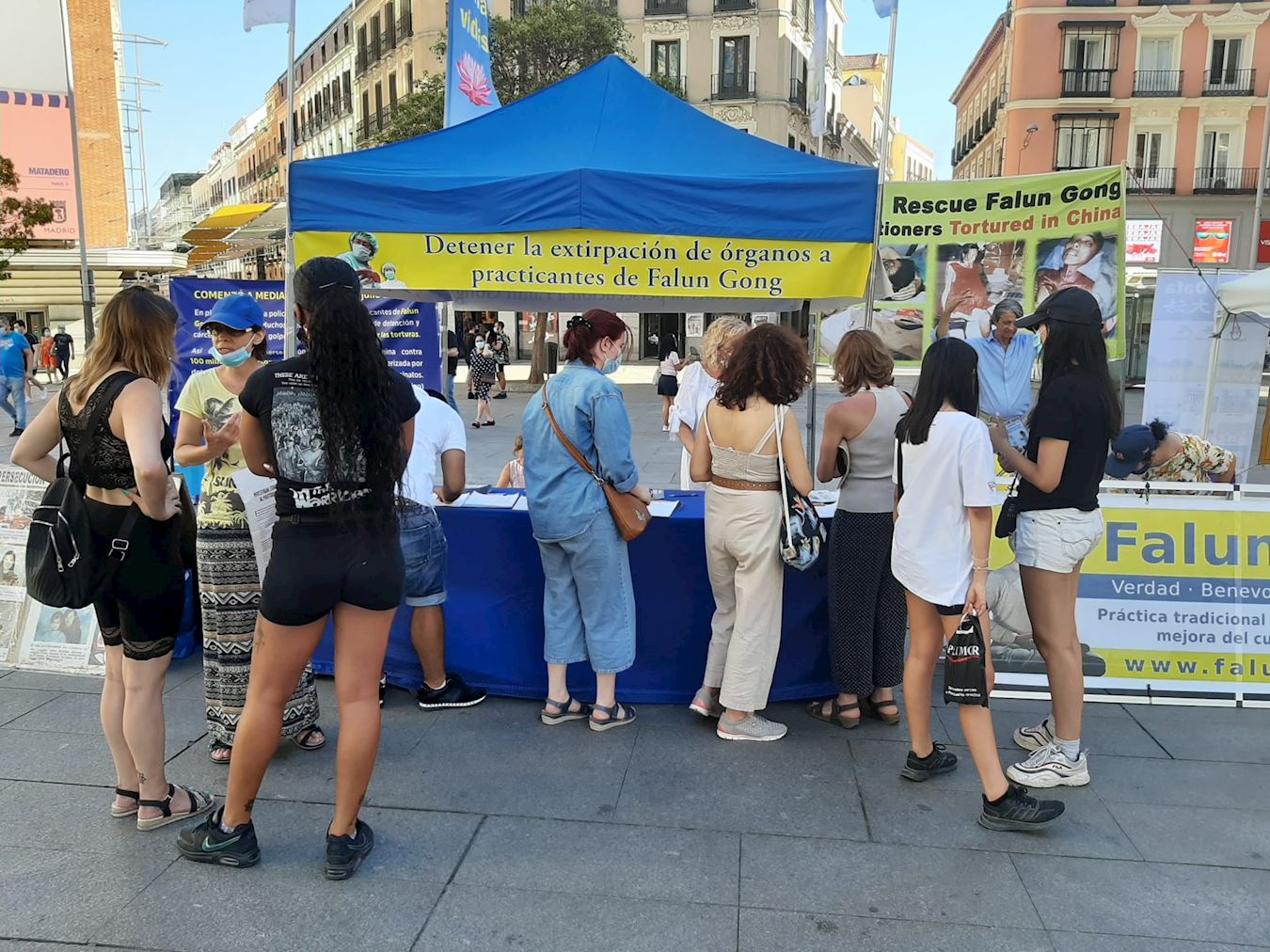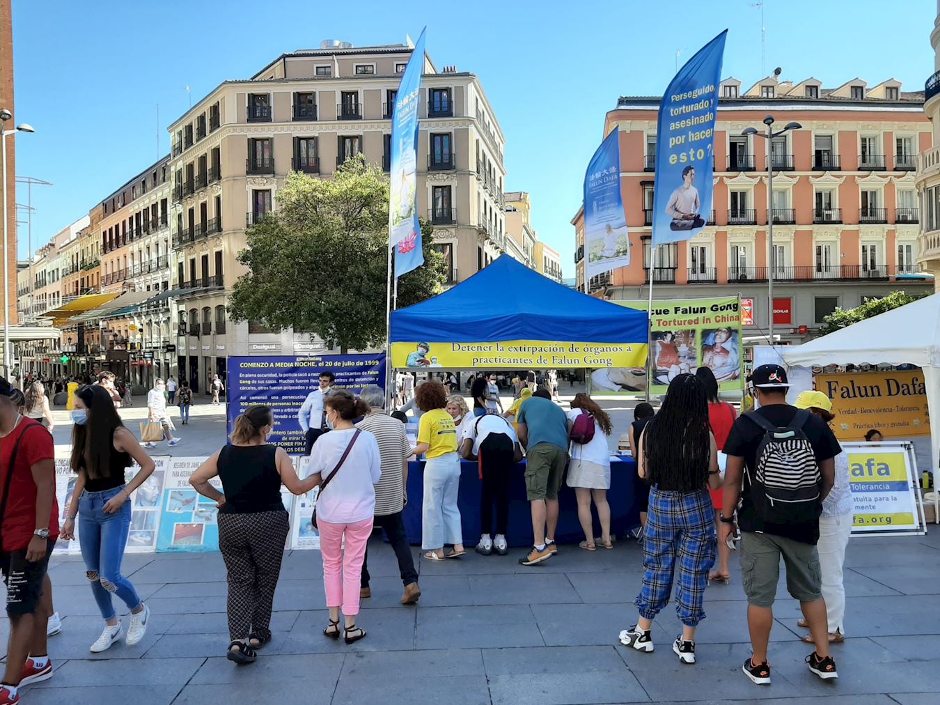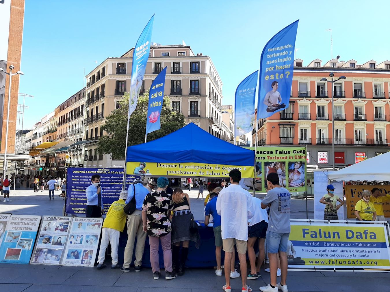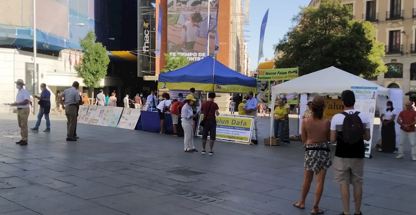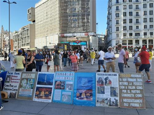 七月十八日,西班牙法轮功学员在马德里的卡亚俄广场(Plaza Callao)向民众讲述法轮功受迫害真相,呼吁制止迫害。炎炎烈日下,法轮功学员的讲真相活动从上午10点持续到晚上7点半。