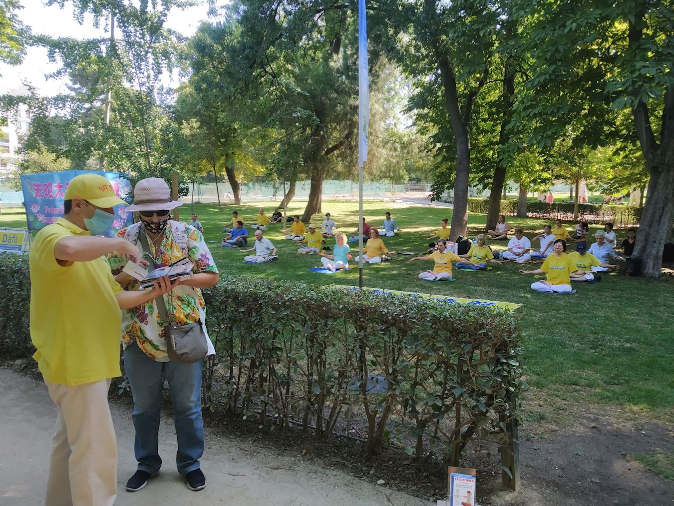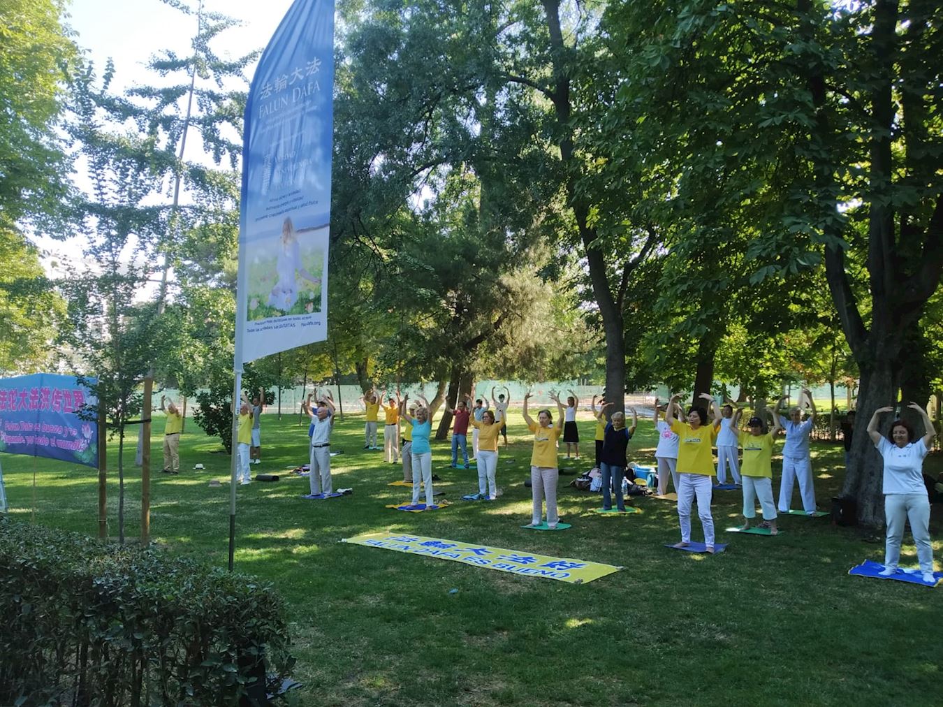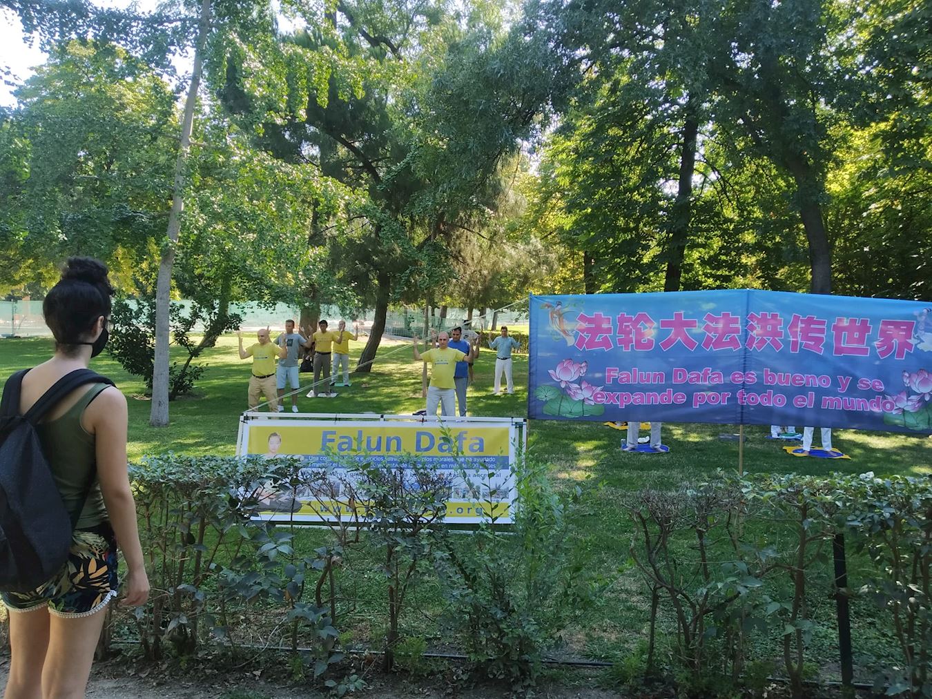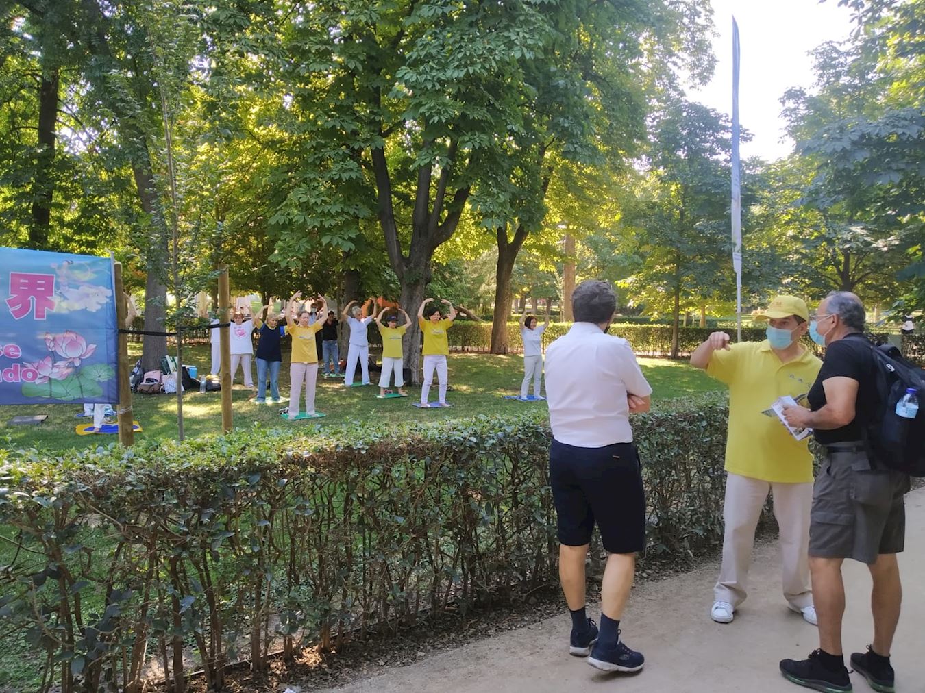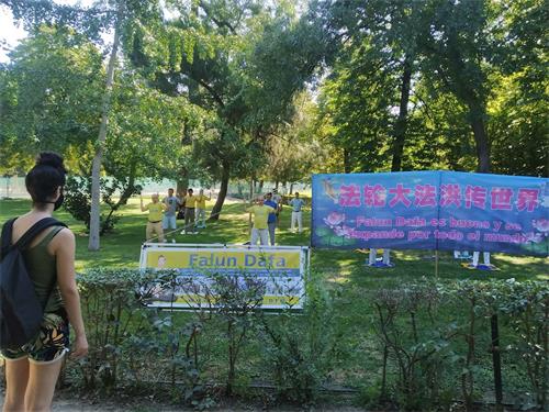 七月十九日(星期日)上午,西班牙法轮功学员在丽池公园集体炼功,优雅的音乐和祥和的炼功场面,吸引了很多路人前来了解法轮功真相。