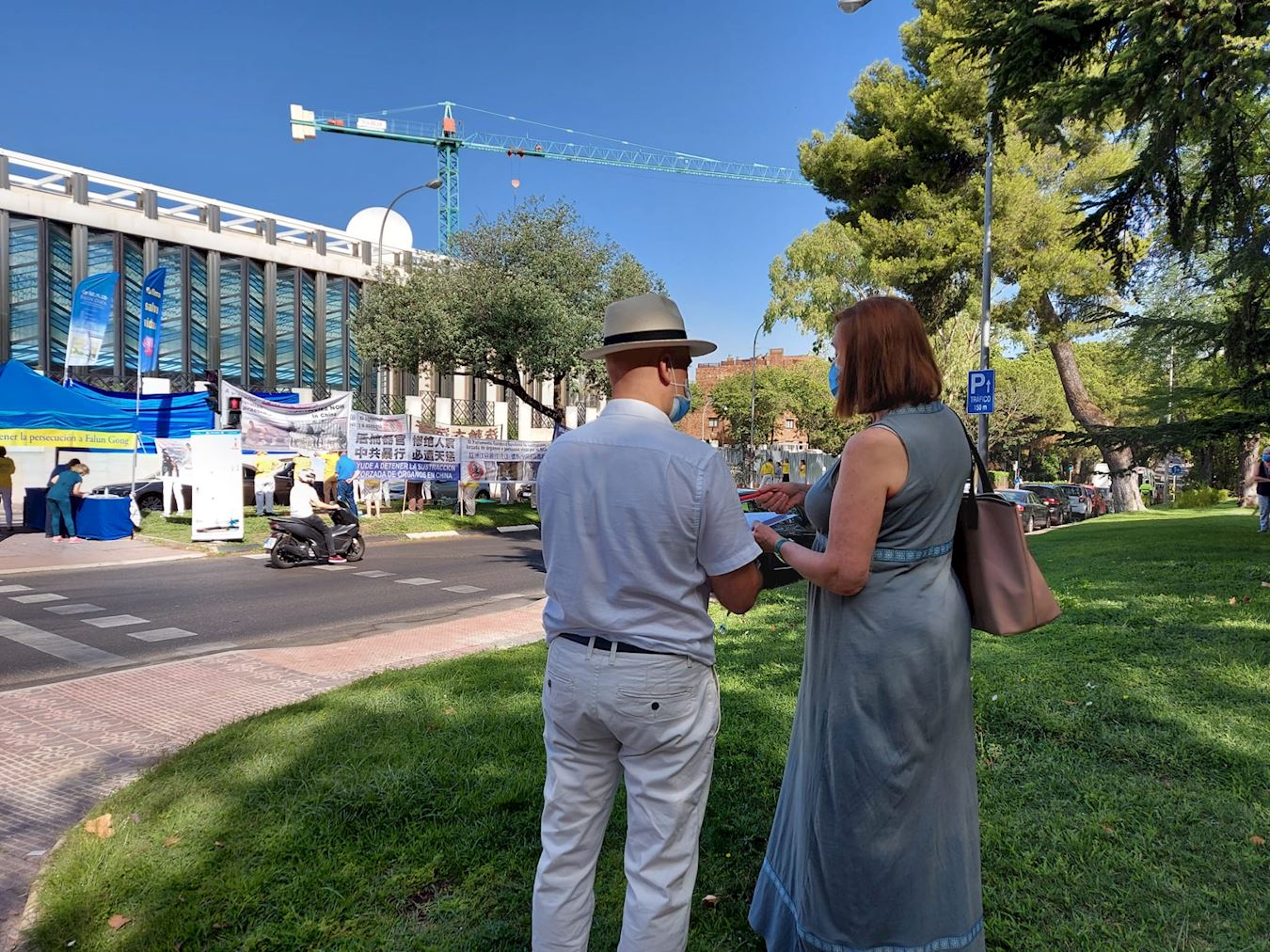 在中共驻西班牙大使馆门外,法轮功学员们的真相横幅在烈日下格外醒目。“法轮大法好”,“停止迫害法轮功”,“活摘器官 惨绝人寰 中共暴行 必遭天谴”等等,许多经过的车辆鸣笛对法轮功学员表示支持。