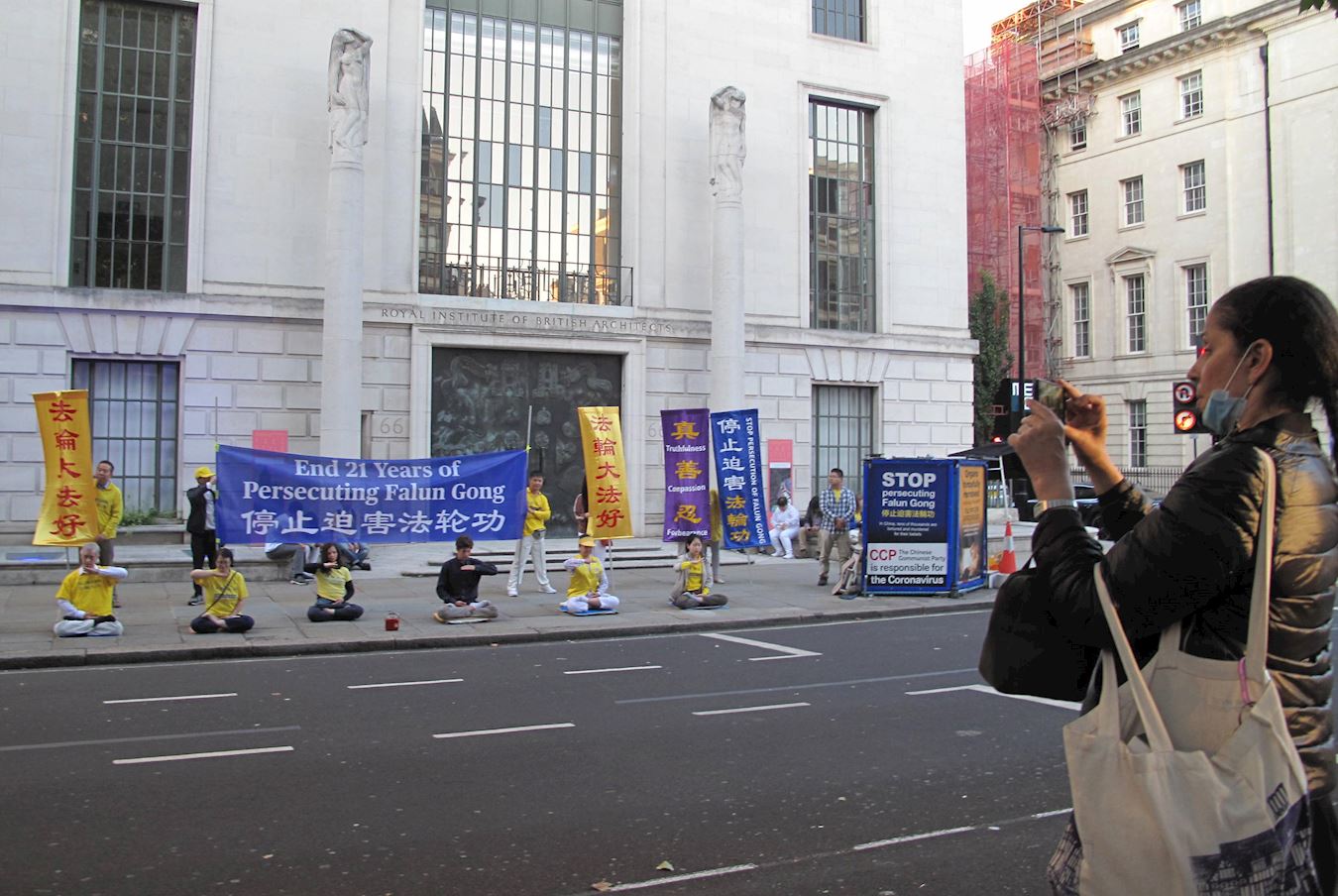 法轮功学员遵守英国政府针对中共病毒瘟疫大流行的社交距离规定,在六个小时的活动中,他们分批赶来轮流参加当天的活动。活动吸引了过往车辆中的司机和路过行人的关注目光。