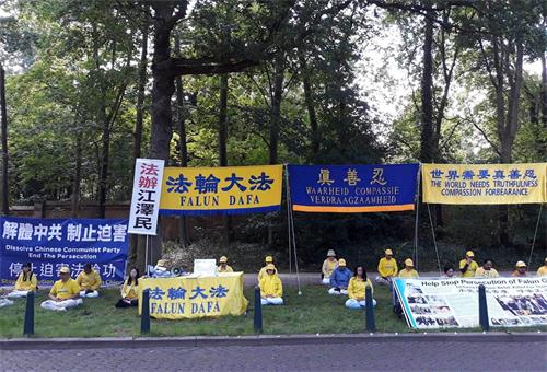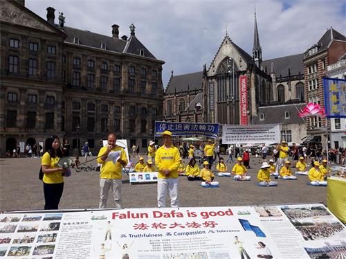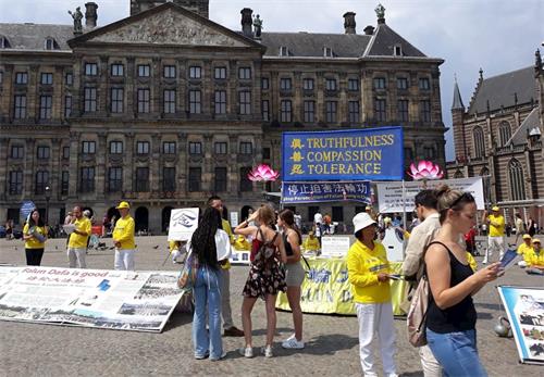 几位法轮功学员向往来游客介绍法轮大法洪传全世界的盛况,以及中共迫害法轮功的事实。一位来自荷兰最北部城市格罗宁根(Groningen)的民众表示想学法轮功,询问他所居住的城市有没有教功的地方。