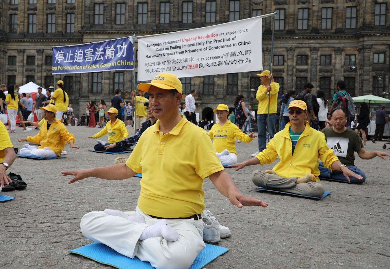 7月18日,法轮功学员来到水坝广场举行活动。活动现场悬挂着中英文横幅:“欧洲议会紧急决议案(P7_TA(2013)0603)呼吁立即停止在中国发生的强摘良心犯器官的行为” 、“停止迫害法轮功”!