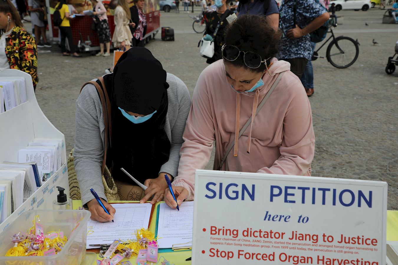有一位法轮功学员向来往行人介绍迫害真相。荷兰人Jessica女士了解情况后表示:“我只看到这些人在和平的打坐,他们的内心一定很平静,我看不到他们哪里有错。我不理解,中国政府为什么要迫害他们?”另一位荷兰人Miriam女士表示:“当我看到‘停止活摘器官’征签时,我立即签字。因为每个生命都是重要的,我希望他们(中共)立即停止这种迫害。”
