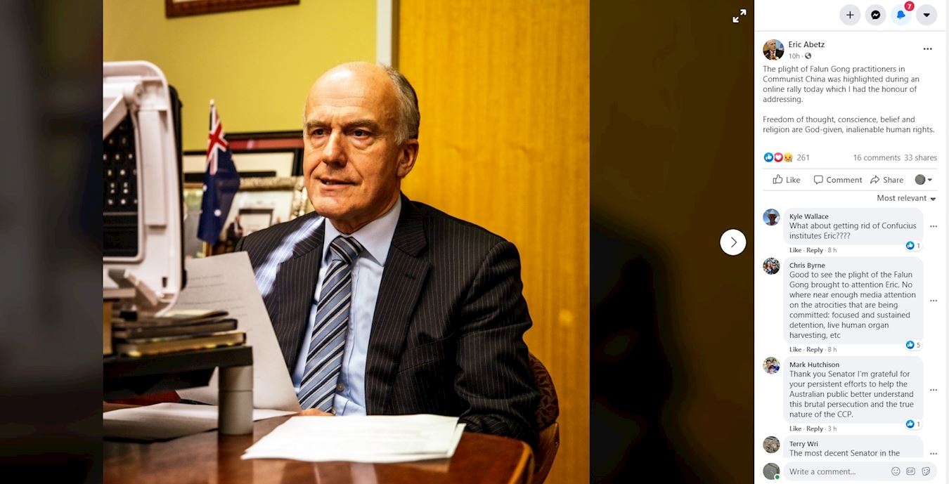 ![]() 图2:二零二零年七月二十日,澳塔州自由党联邦参议员、参议院外交事务立法委员会主席埃里克・阿贝茨先生(Senator the Hon Eric Abetz)参加了当天的网络集会后在其脸书上配图帖文,表示非常荣幸作为嘉宾发言。 |