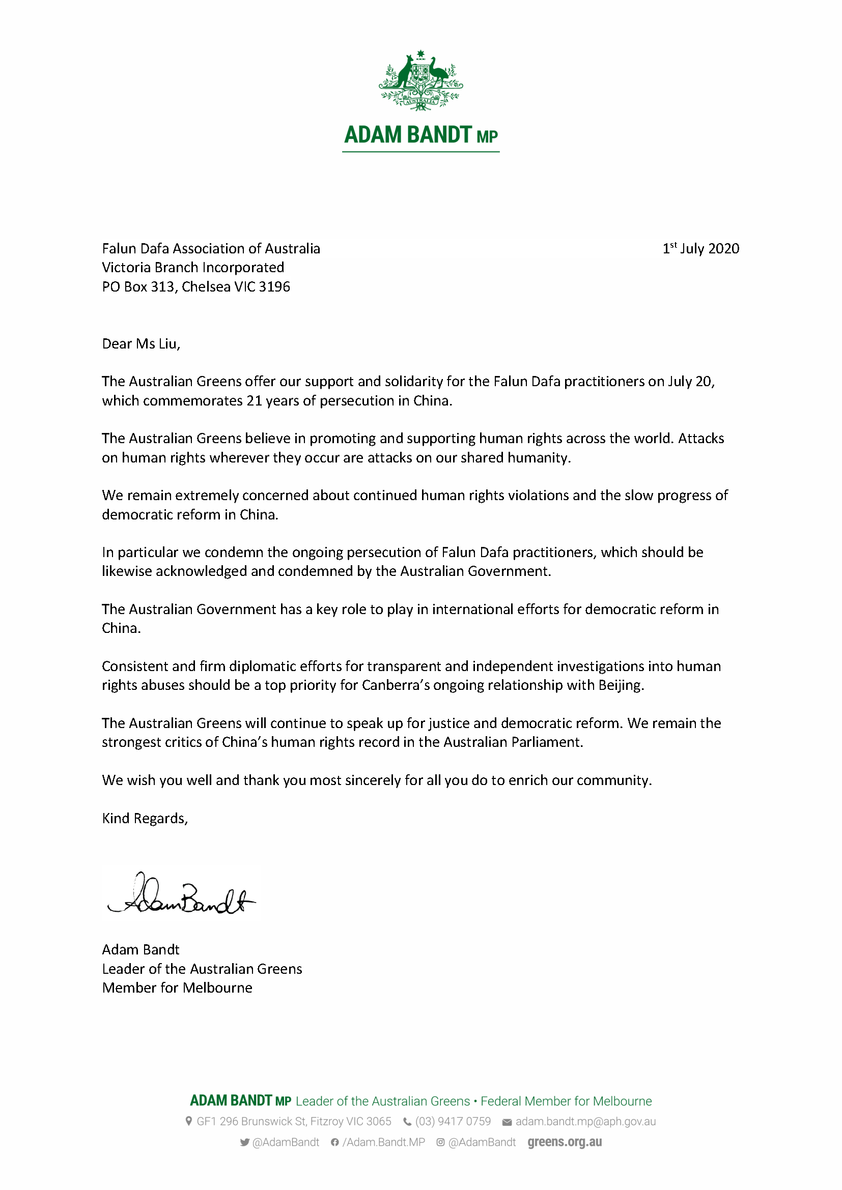 ![]() 图6:维州联邦议员、绿党领袖亚当・班特(Adam Bandt)发来的支持信函。 |