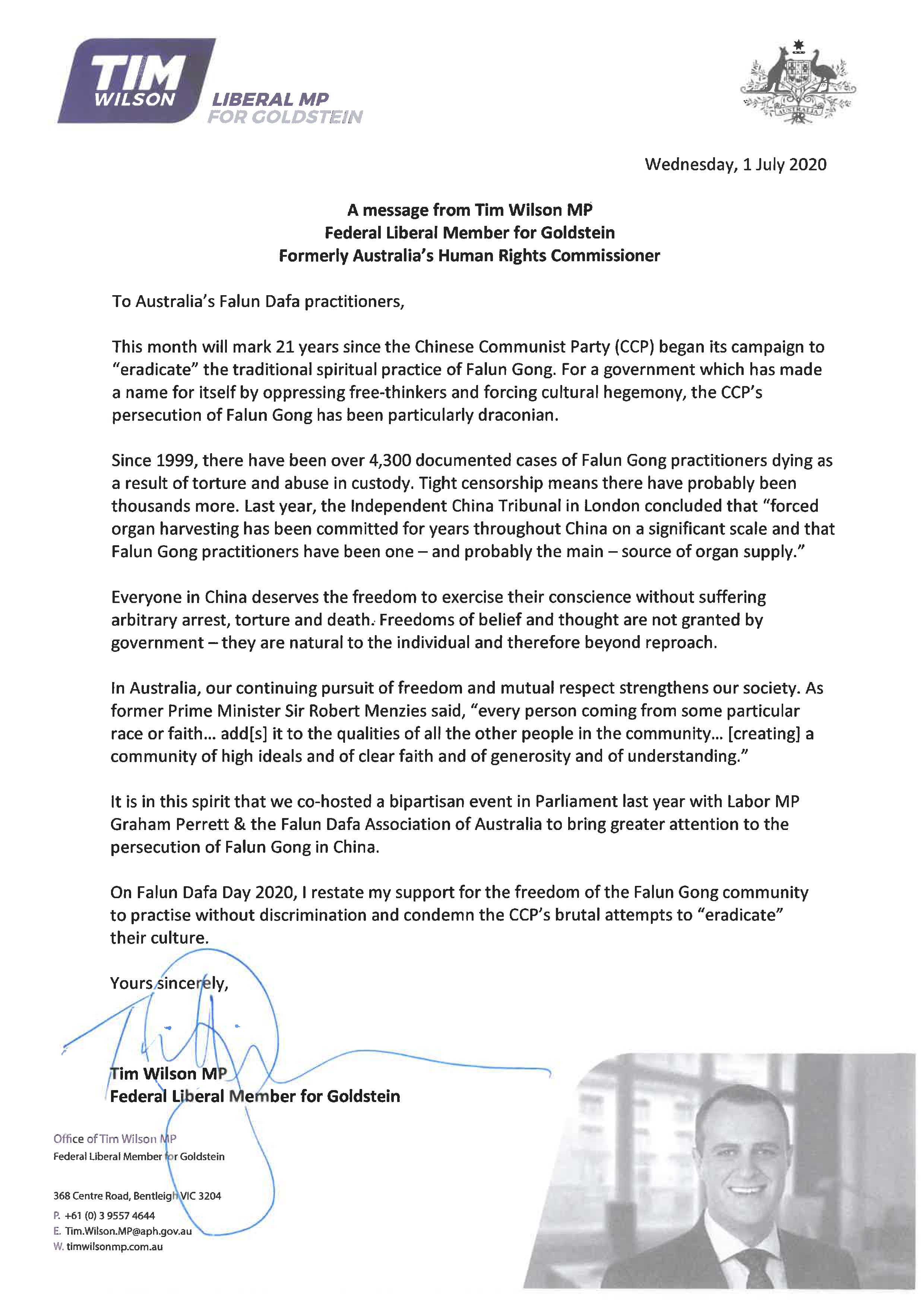 维州自由党联邦议员蒂姆・威尔逊(Tim Wilson)为集会发来支持信,在信中他表示,中共因打压自由思想和推行文化霸权而臭名昭著,它对法轮功的迫害尤为残酷。