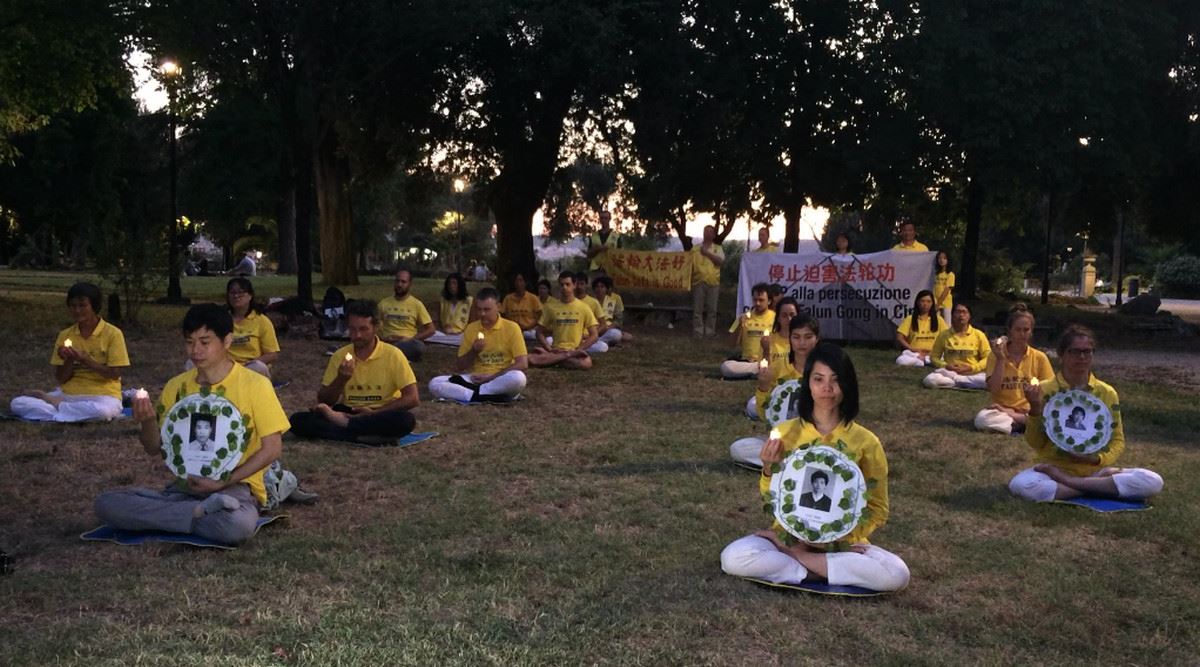 当夜幕降临时,法轮功学员又到罗马的VILLA BORGHESS公园集体炼功并举办烛光守夜,悼念二十一年来被中共迫害致死的法轮功学员。