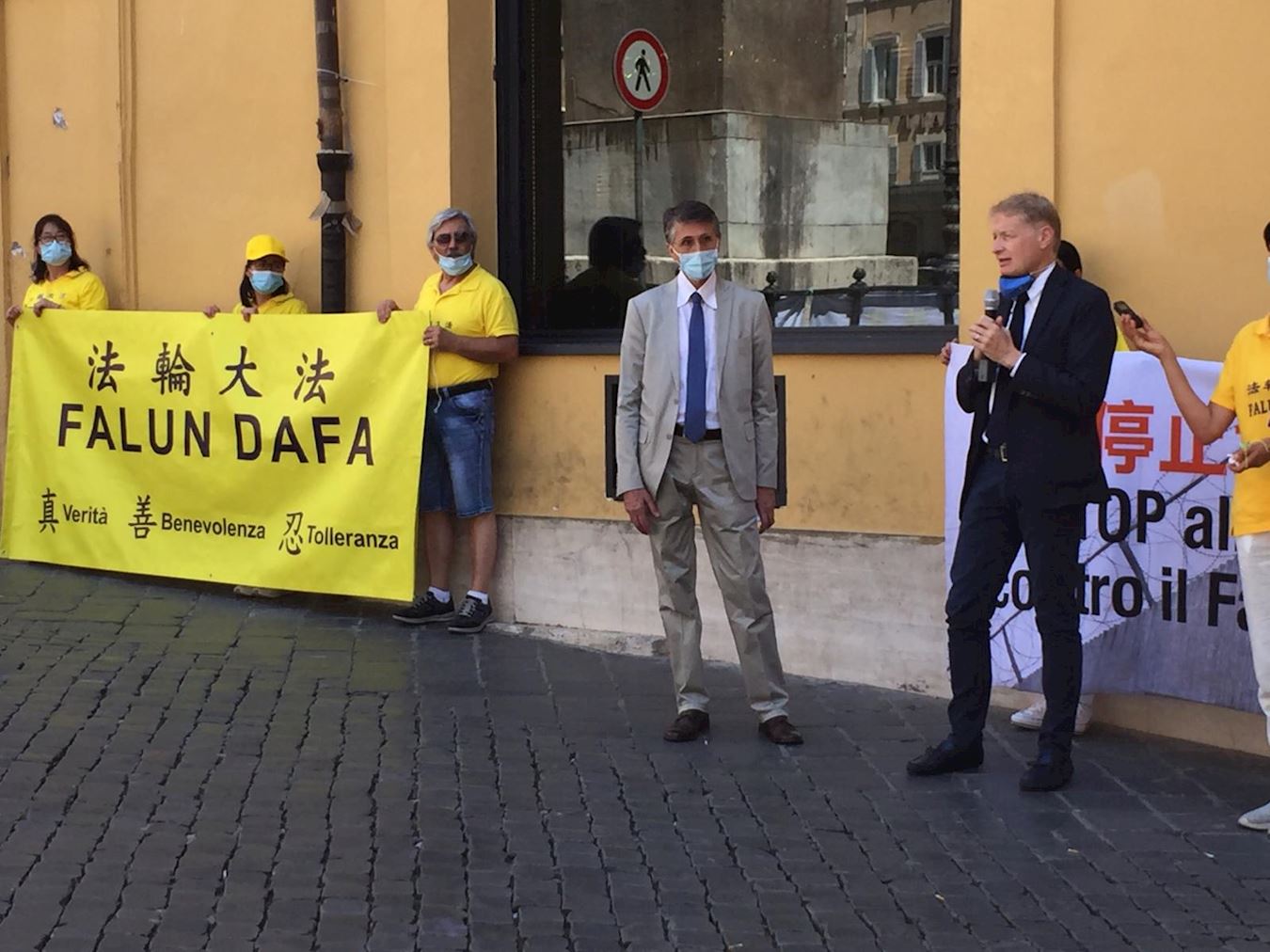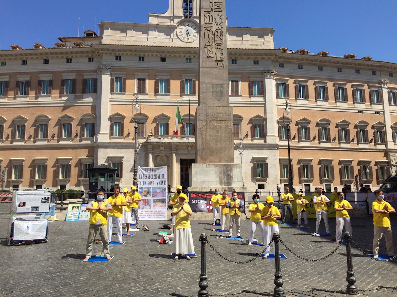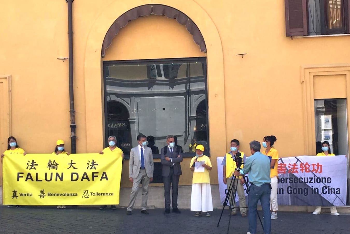 二零二零年七月二十日,意大利各地区的部份法轮功学员来到首都罗马,在中共驻意大利大使馆前集会,要求立即停止迫害法轮功。参加活动的法轮功学员一直在集体炼功、展示传递“真善忍”、“法轮大法好”福音与“停止迫害法轮功”真相信息,坚持平和地表达心声、传递真相。