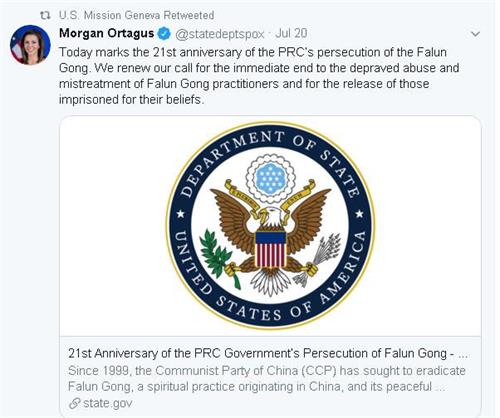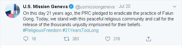 同一天,美国驻日内瓦外交使团还在推特上刊登美国国务院发表的要求中共停止迫害法轮功的声明,并在推特上说,今天是中共迫害法轮功二十一周年,我们再次要求立即停止对法轮功学员邪恶的虐待和凌辱,立即释放那些因信仰而被关押的人。