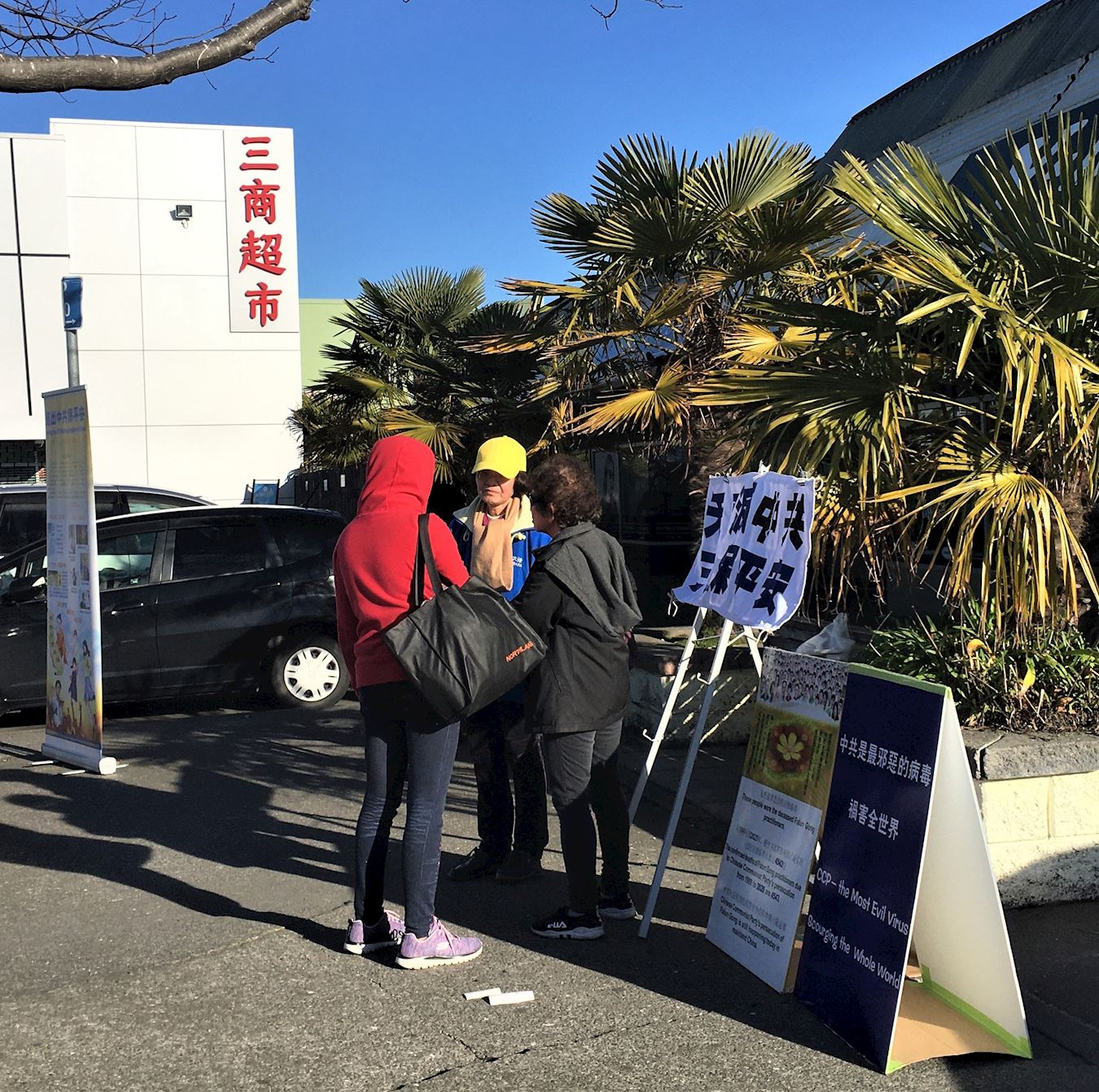 七月二十五日下午,基督城法轮功学员来到Church Corner讲真相劝三:退.。Church Corner地区聚集一些亚洲超市和餐厅,是中国游客和新西兰华人购物聚餐的地方。当天天气晴朗,前来购物吃饭的华人络绎不绝。