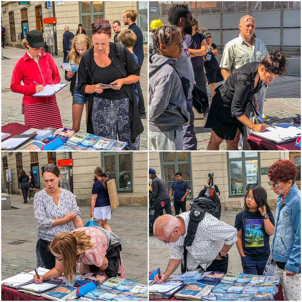 二零二零年七月二十八日周二中午,法轮功学员在瑞典首都斯德哥尔摩市中心国会大厦(Riksdag)旁的钱币广场(Mynttorget),举办讲真相活动,向过往民众展示法轮大法的美好,揭露中共对法轮功长达二十一年的残酷迫害。活动得到瑞典当地民众的关注,很多人签名支持法轮功学员反迫害的正义之举。