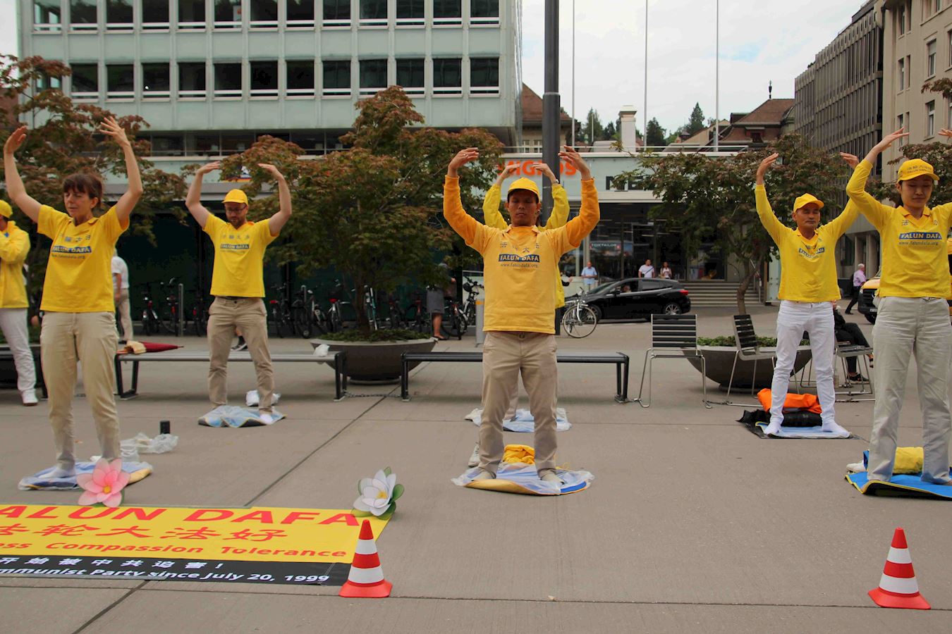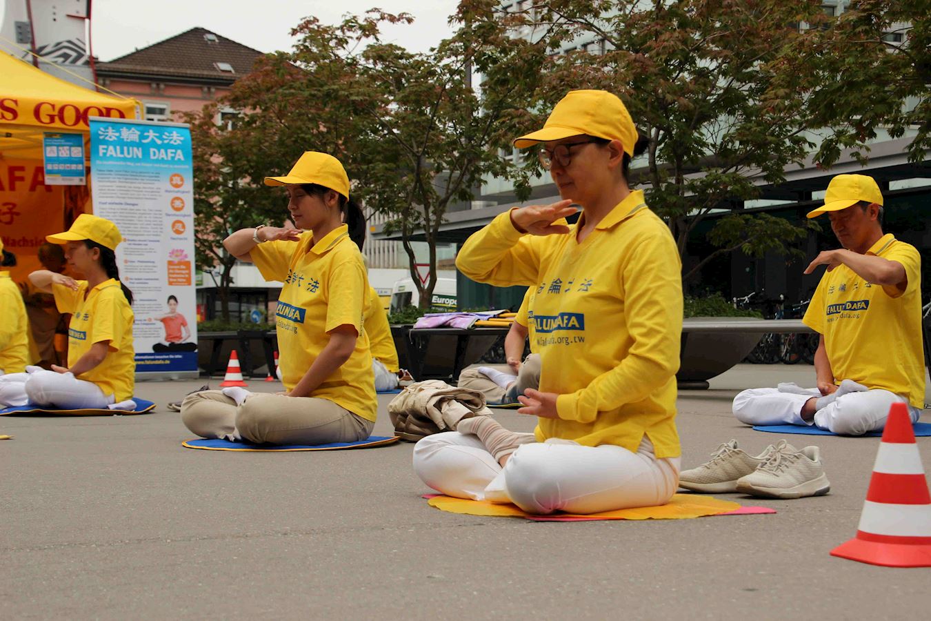 活动地点在火车站附近的购物中心,正对当地一家有名的咖啡店。在露天享用咖啡的顾客可以静静地观看法轮功学员祥和的功法演示,聆听演讲。很多路人也驻足观看,有的干脆坐下来休息,并仔细阅读真相资料,有的向法轮功学员了解更多的讯息,有的主动要求签名支持,还有的希望能多带一份真相资料与朋友分享。