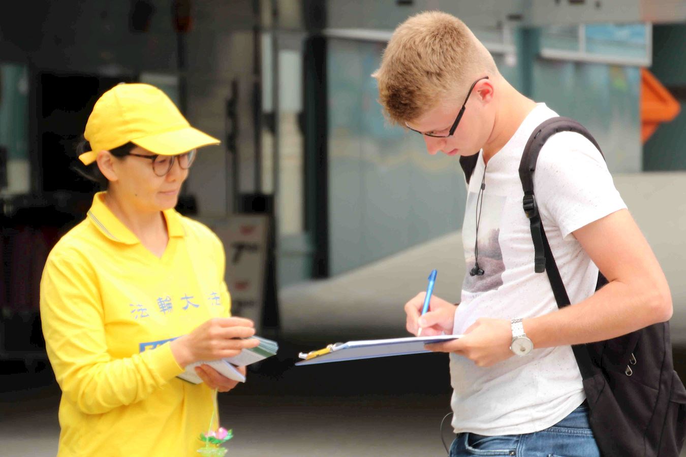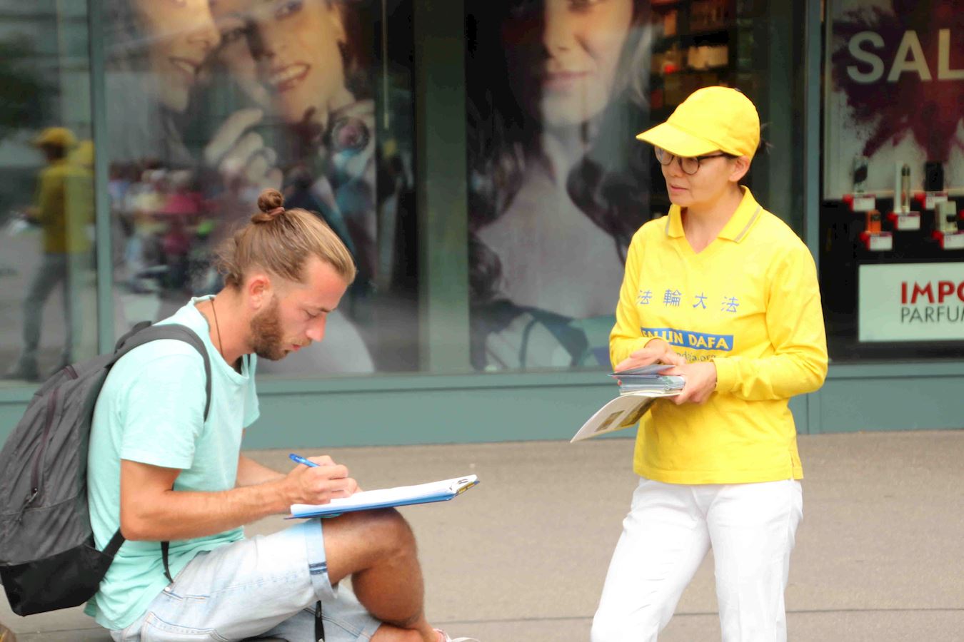 她希望通过签名:“能够让人自由地接受法轮功,不再有(迫害)这样的恶行。(法轮功学员能有)信仰自由,言论自由,集会自由,在中国也能够像在这一样能够演示功法,不会被歧视。”最后她说:“我同意你们(法轮功学员)的观点。你们能在瑞士为这样的权利(反迫害)而付出,我觉得你们很有勇气,这可不容易。”